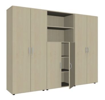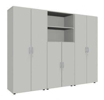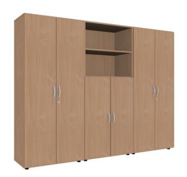 Büro Schrankwand 3021 Mega, 5 Ordnerhöhen, Gesamtbreite 240 cm bestehend aus 2 Schränken und einem Kombischrank. Dekorfarben in Ahorn Buche oder Lichtgrau.