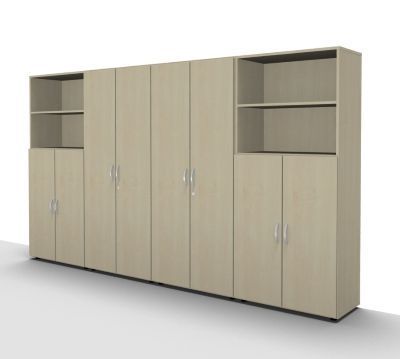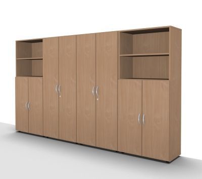 Büro Schrankwand 3210 Mega, 5 Ordnerhöhen, Gesamtbreite 320 cm bestehend aus Aktenschränken verschließbar und Kombischränken mit Türen 3 Ordnerhöhen. Dekorfarbe in Ahorn Buche Weiß oder Lichtgrau.