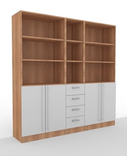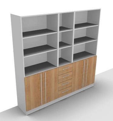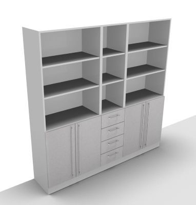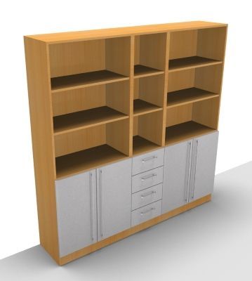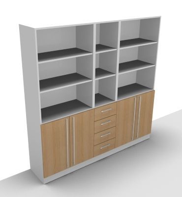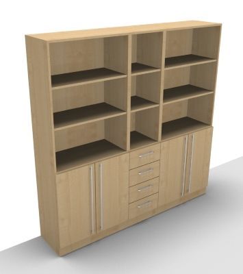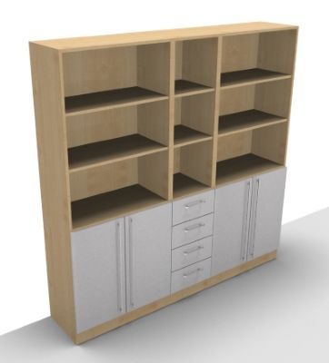Büro-Schrankwand Multi 2, 5 Ordnerhöhen, Gesamtbreite 200,6 cm bestehend aus 2 Kombischränken mit Türen 2 Ordnerhöhen und einem Regal mit 4 Schubladen in verschiedenen Dekorfarben erhältlich.