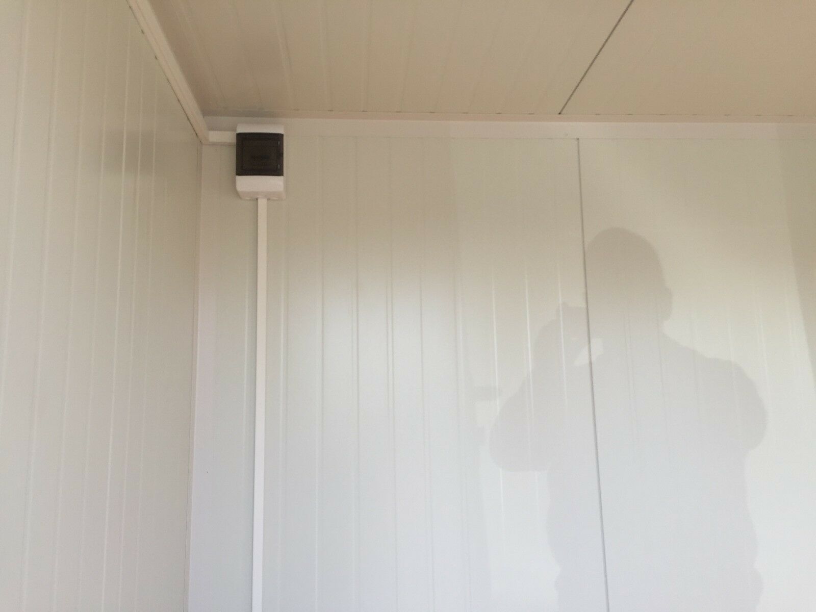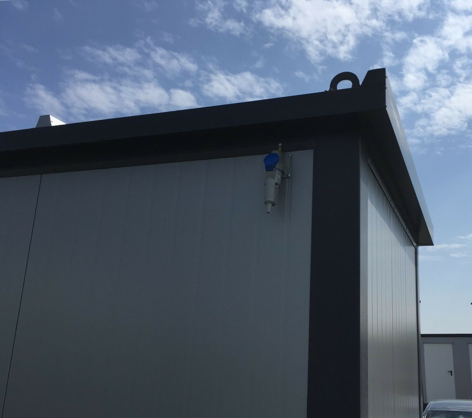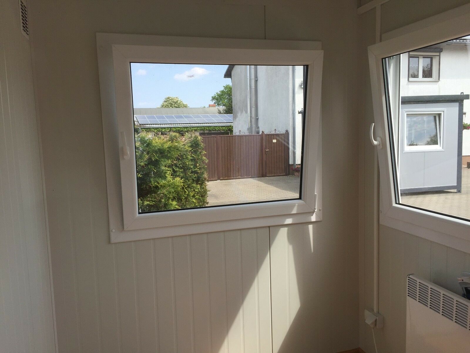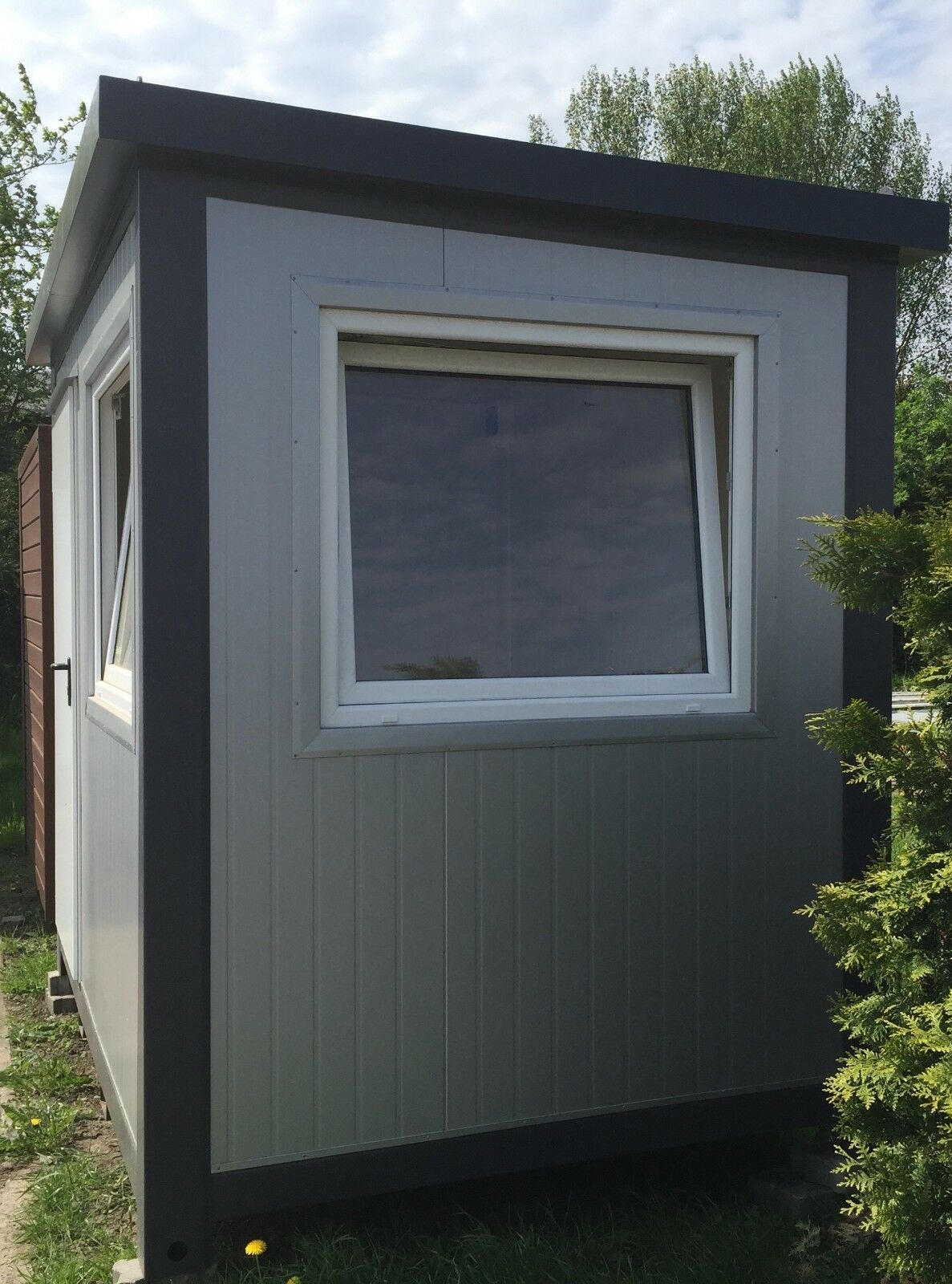 Bürocontainer 3,00 x 2,00 Meter, 2,70 Meter hoch. Die Konstruktion besteht aus Stahl 100x50x4 mm, wodurch Stabilität gewährleistet ist. Die Wände sind aus Sandwichplatten mit einer Dicke von 75 mm gefertigt. Der Fußboden ist aus OSB Platten auf Stahluntergestell 100x100mm gefertigt.1 Dreh- Kipp PVC