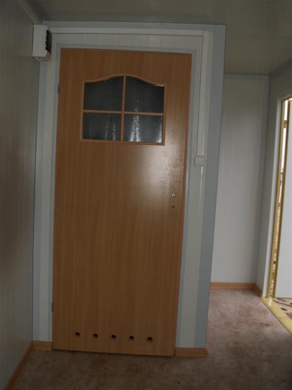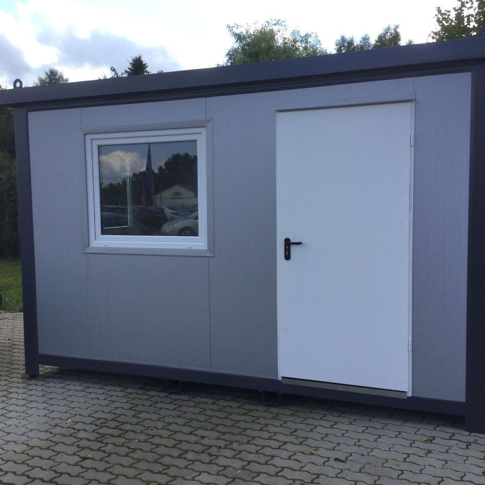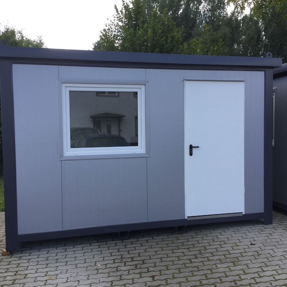 Bürocontainer mit WC-Raum 4,00 x 2,00 Meter, 2,62 Meter hoch ( mit Ösen ca.2,72 m hoch). Die Konstruktion besteht aus Stahl 100x50x4 mm, wodurch die Stabilität gewährleistet ist. Die Wände sind aus Sandwichplatten mit einer Stärke von 75 mm gefertigt. Fußboden ist aus OSB Platten auf einem Stahlunte