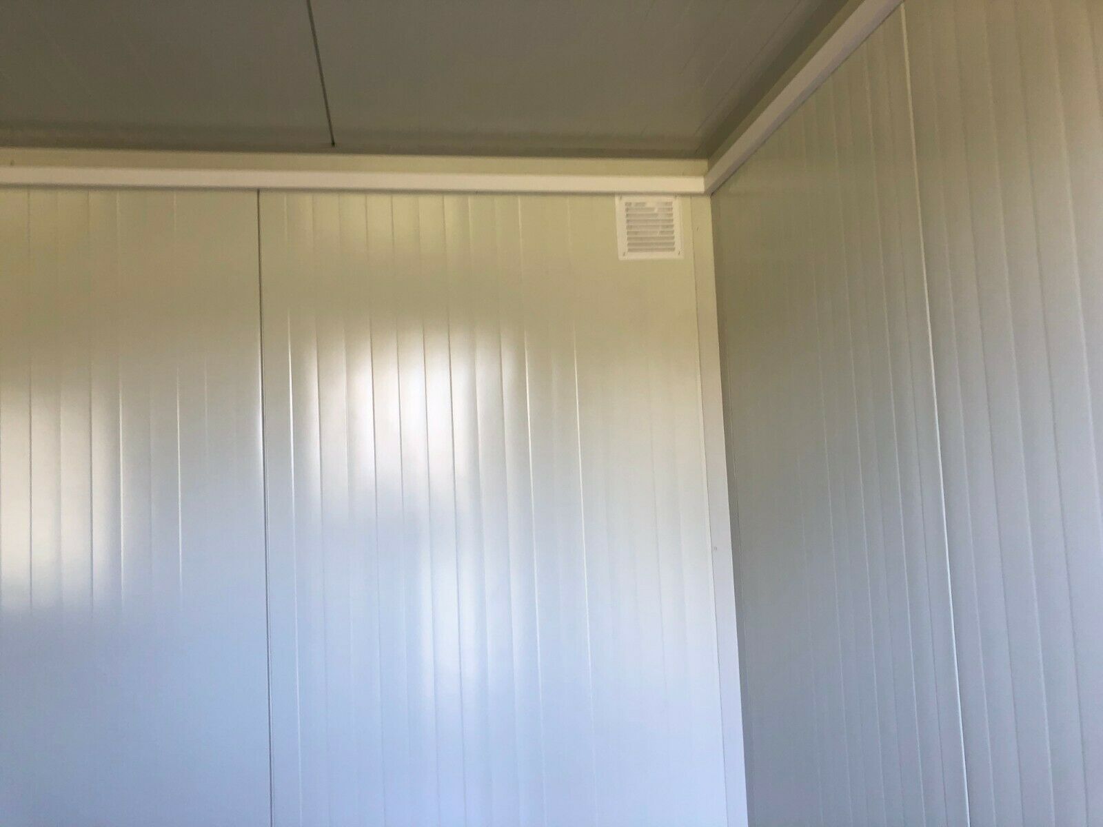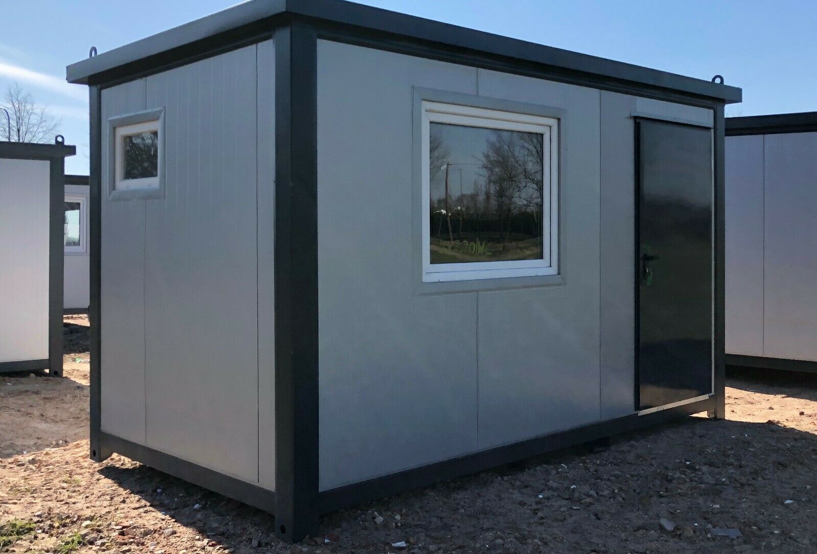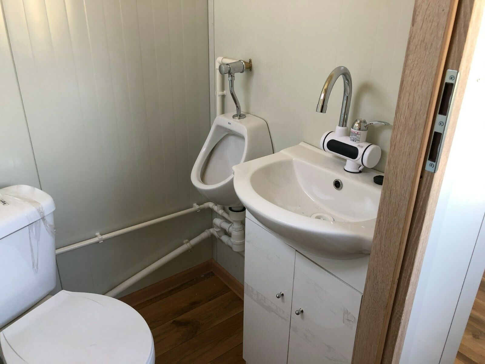 Bürocontainer mit WC-Raum +Urinal 4,00 x 2,20 Meter, 2,62 Meter hoch ( mit Ösen 2,70 m hoch). Die Konstruktion besteht aus Stahl 100x50x4 mm, wodurch die Stabilität gewährleistet ist. Die Wände sind aus Sandwichplatten mit einer Stärke von 75 mm gefertigt. Fußboden ist aus OSB Platten auf einem Stah