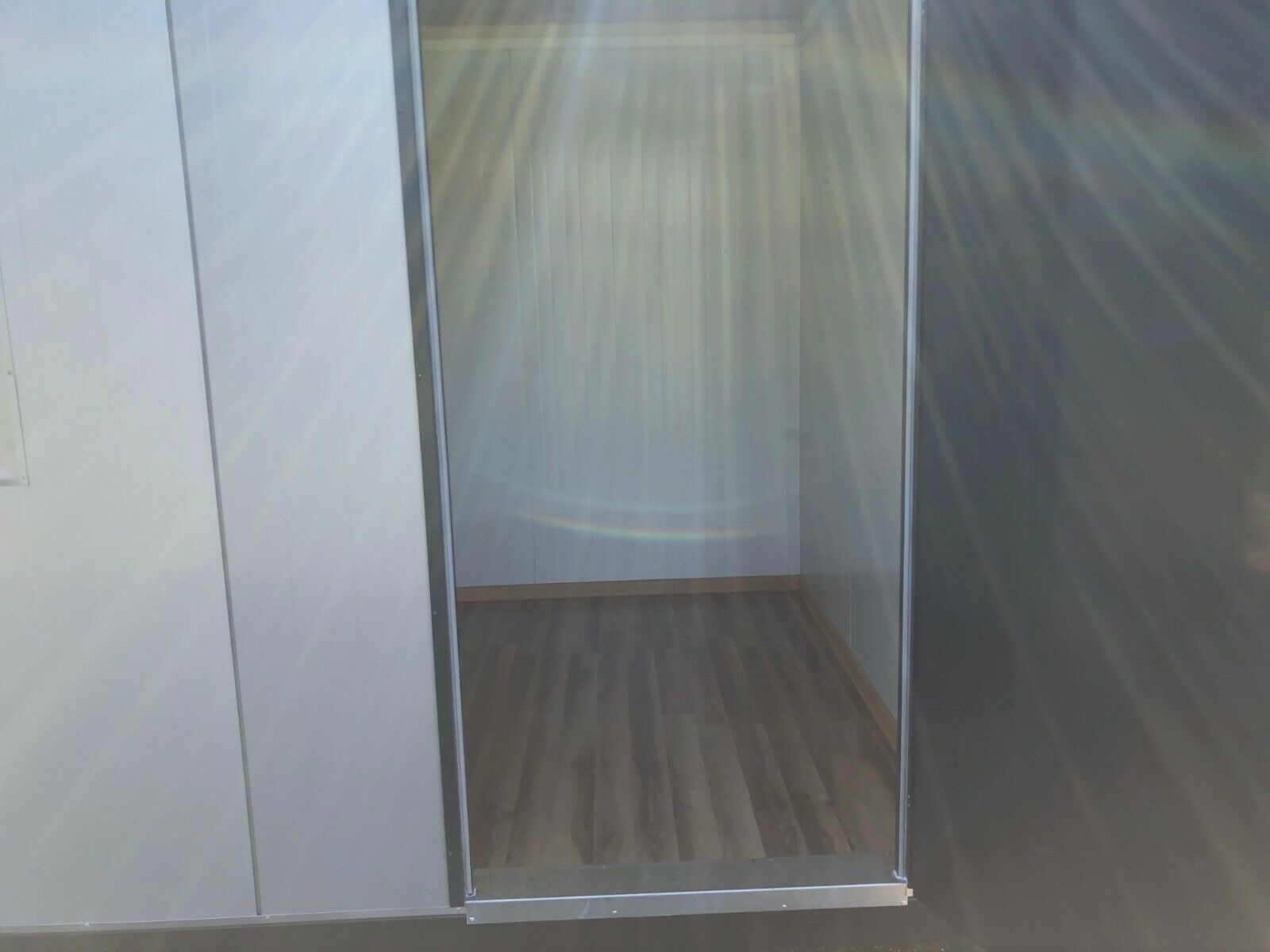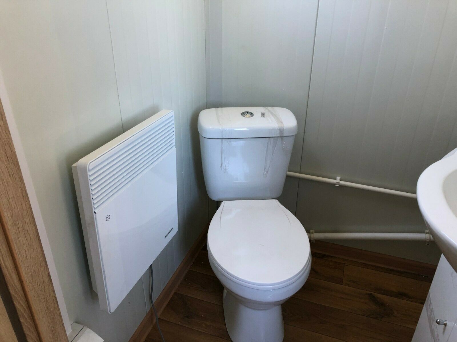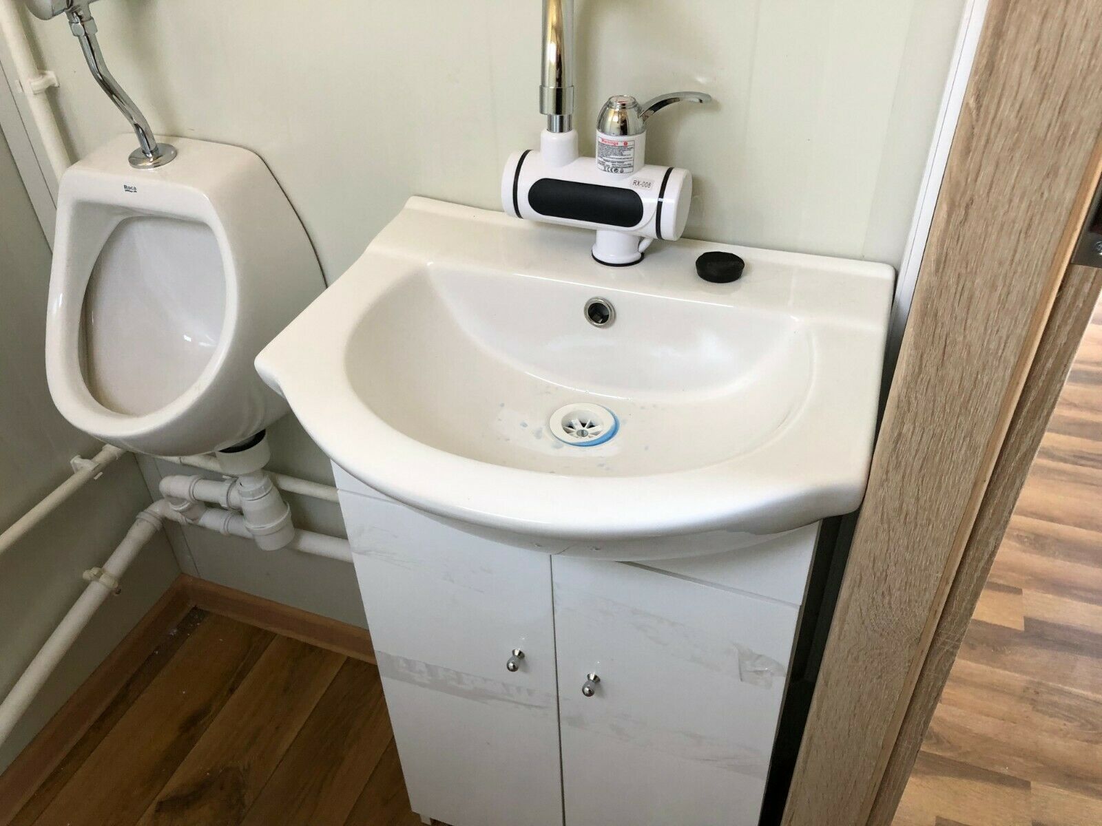 Bürocontainer mit WC-Raum +Urinal 4,00 x 2,20 Meter, 2,62 Meter hoch ( mit Ösen 2,70 m hoch). Die Konstruktion besteht aus Stahl 100x50x4 mm, wodurch die Stabilität gewährleistet ist. Die Wände sind aus Sandwichplatten mit einer Stärke von 75 mm gefertigt. Fußboden ist aus OSB Platten auf einem Stah