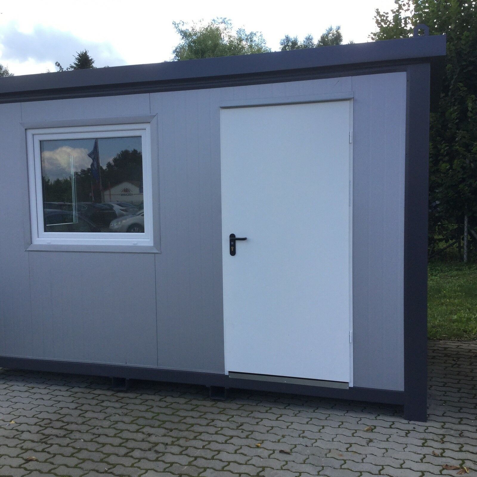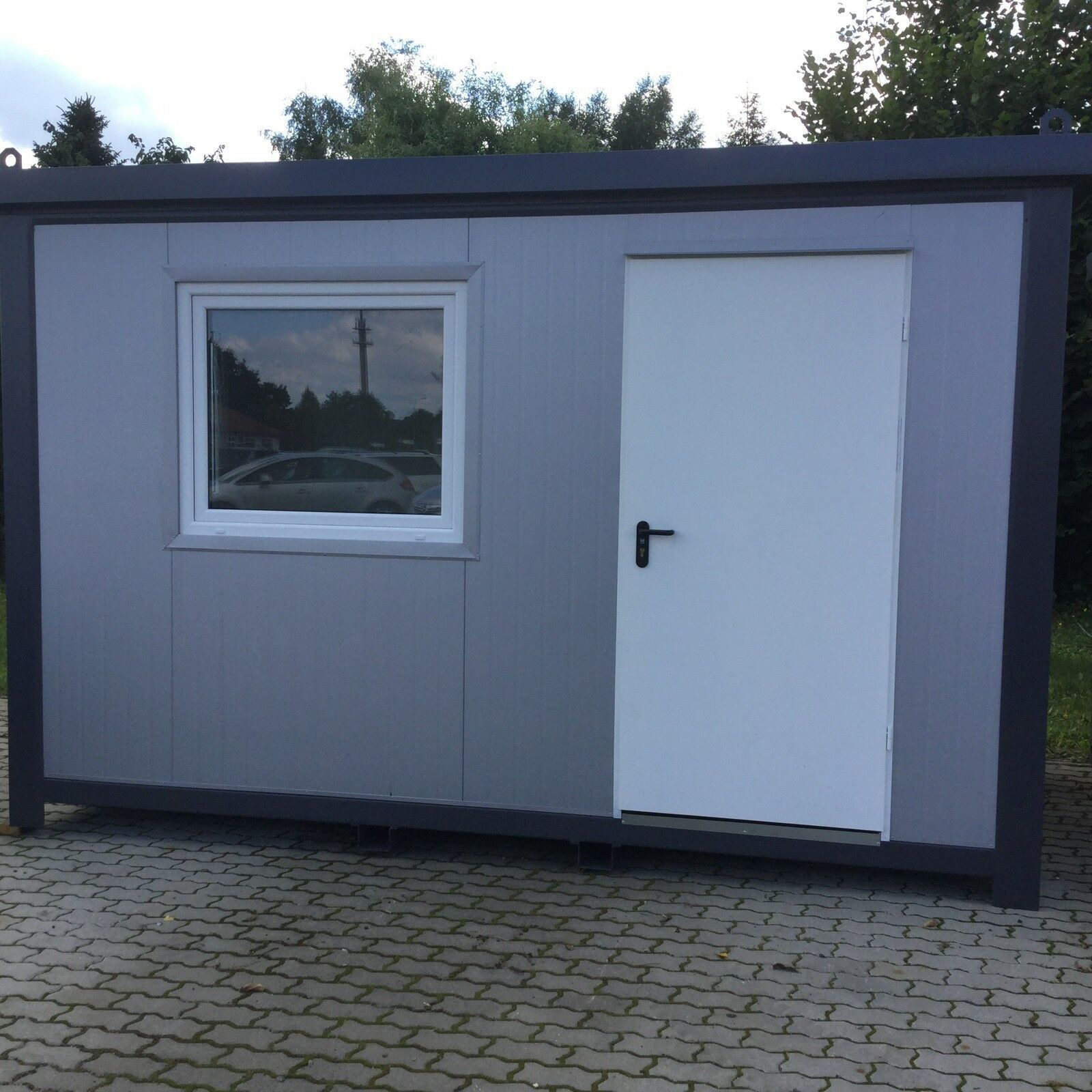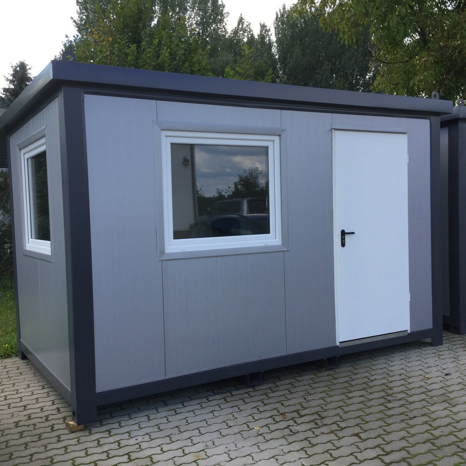 Bürocontainer 4,00 x 2,40 Meter, 2,70 Meter hoch. -Wände u. Dach Sandwichelemente 8 cm Isolierung. - 2 Fenster Dreh Kipp (Doppelverglasung) - Wärmegedämmtes Sandwichprofil für geringen Energieverlust - Hörmann Stahlblech Außentür - Komplette Elektroinstallation nach EG Richtlinien - Steckdosen 230V