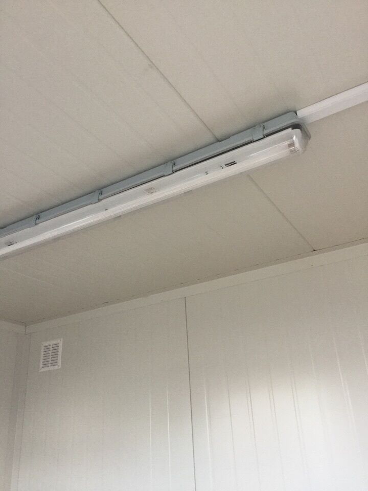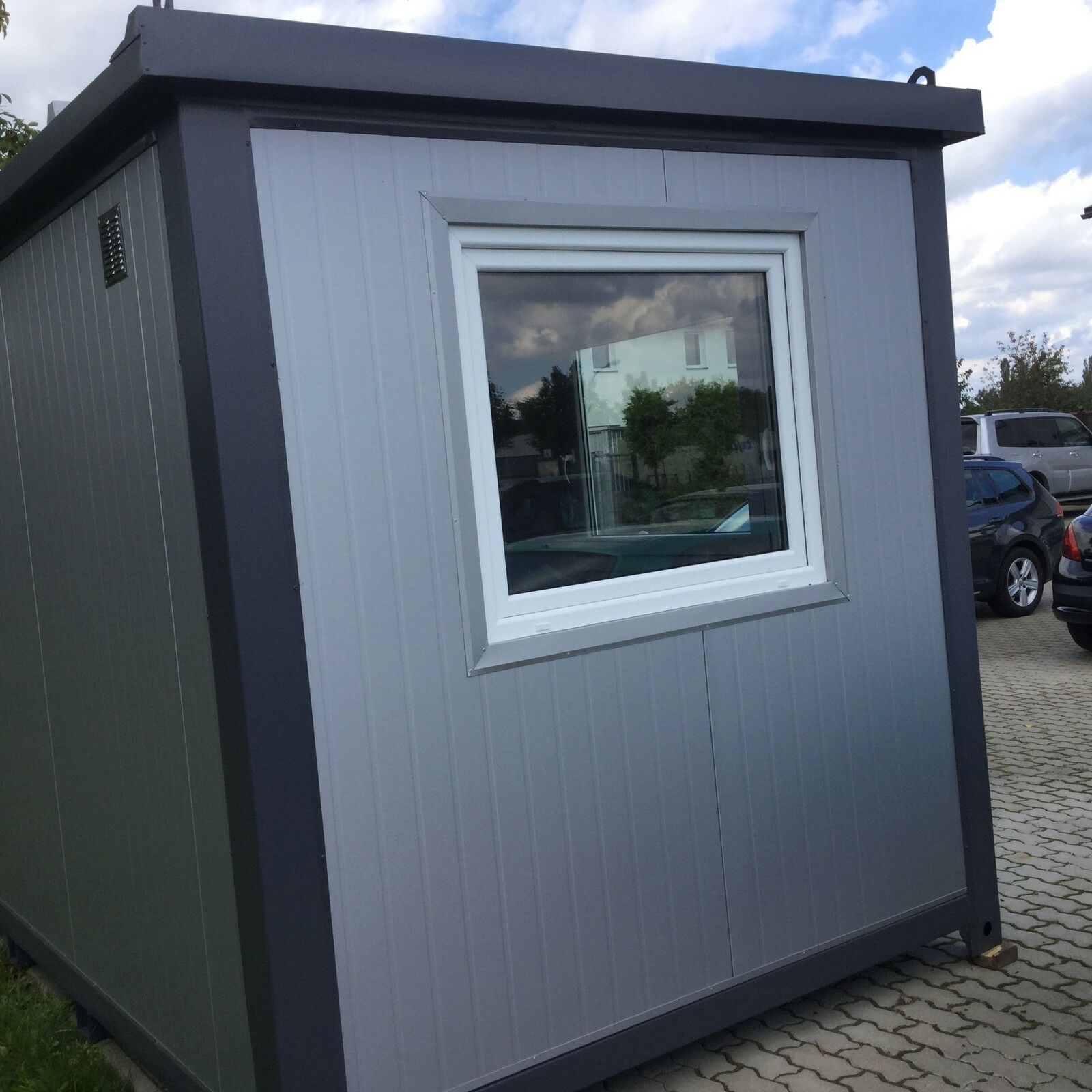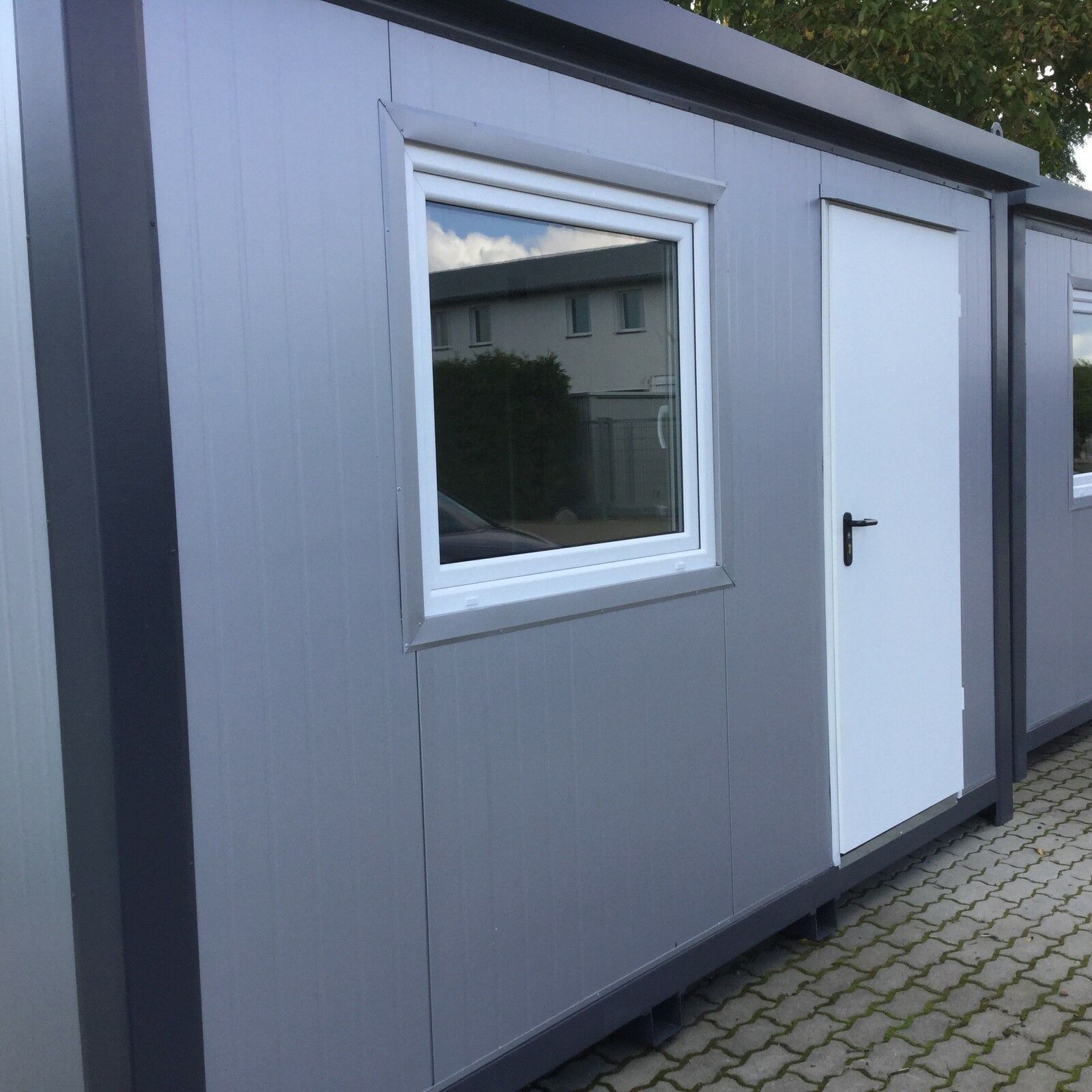 Bürocontainer 4,00 x 2,40 Meter, 2,70 Meter hoch. -Wände u. Dach Sandwichelemente 8 cm Isolierung. - 2 Fenster Dreh Kipp (Doppelverglasung) - Wärmegedämmtes Sandwichprofil für geringen Energieverlust - Hörmann Stahlblech Außentür - Komplette Elektroinstallation nach EG Richtlinien - Steckdosen 230V