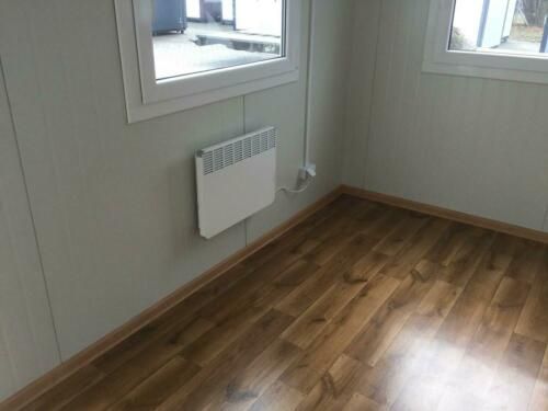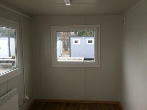 Bürocontainer 4,00 x 2,40 Meter, 2,70 Meter hoch. Die Konstruktion besteht aus Stahl 100x50x4 mm, wodurch Stabilität gewährleistet ist. Die Wände sind aus Sandwichplatten mit einer Dicke von 75 mm gefertigt. Der Fußboden ist aus OSB Platten auf Stahluntergestell 100x100mm gefertigt.1 Dreh- Kipp PVC