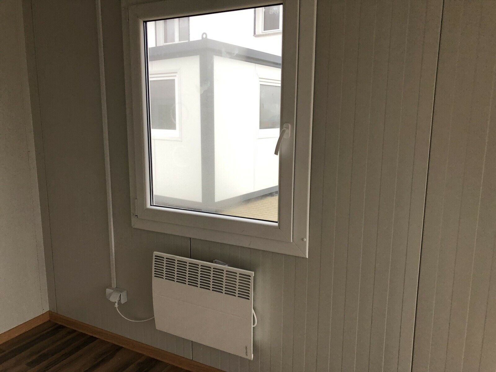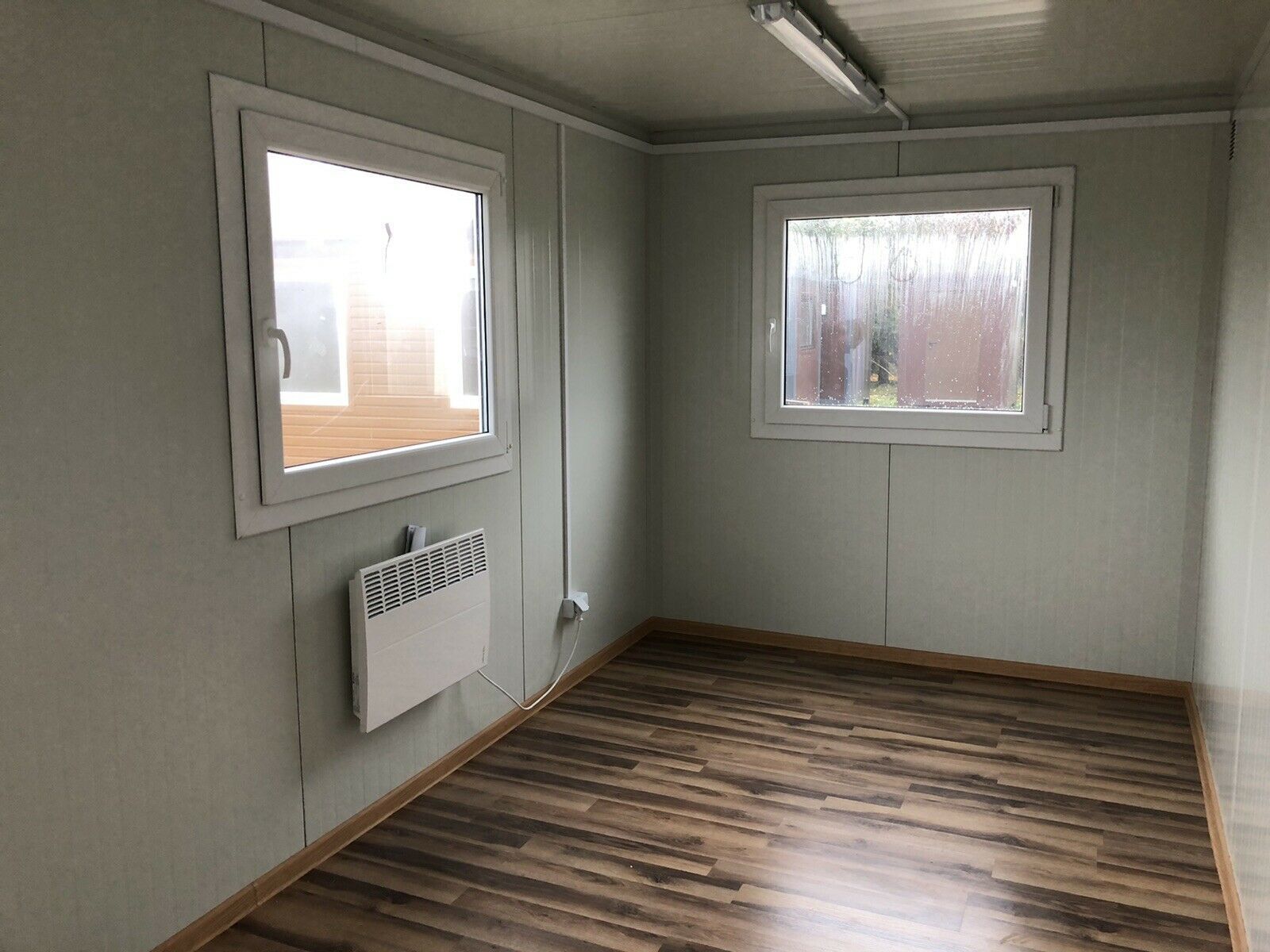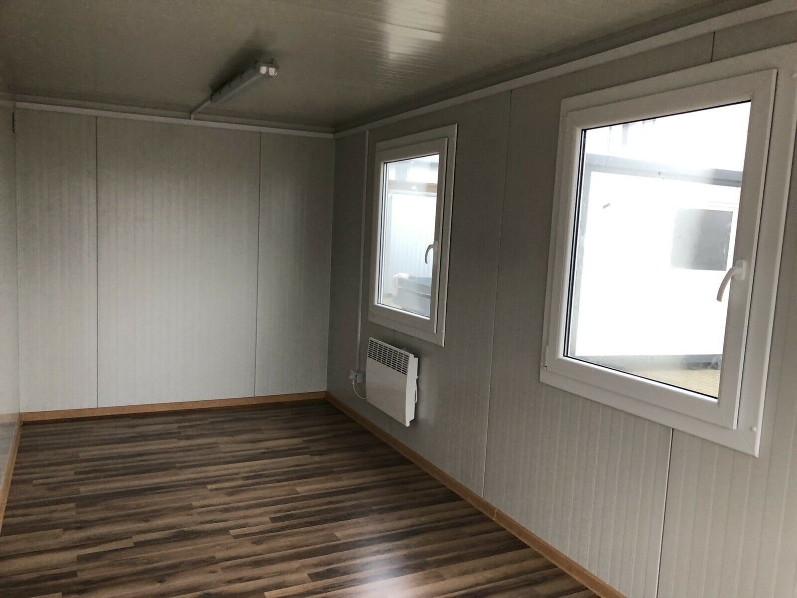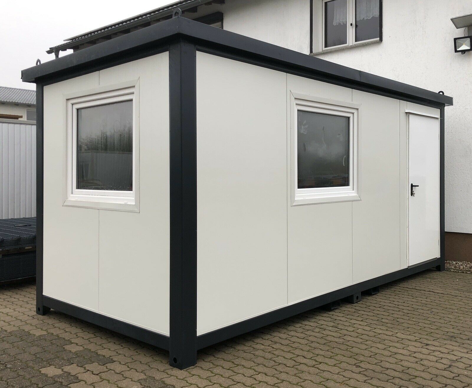 Bürocontainer 5x 2,40 Meter, 2,70 Meter hoch. -Wände u. Dach Sandwichelemente 7,5cm Isolierung. - 2 Fenster Dreh Kipp (Doppelverglasung) - Wärmegedämmtes Sandwichprofil für geringen Energieverlust - Hörmann Stahlblech-Außentür - Komplette Elektroinstallation nach EG Richtlinien - Steckdosen 230V - 1