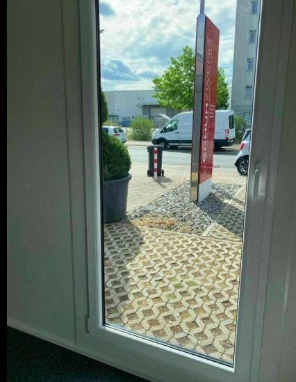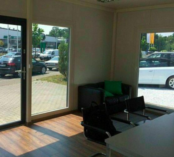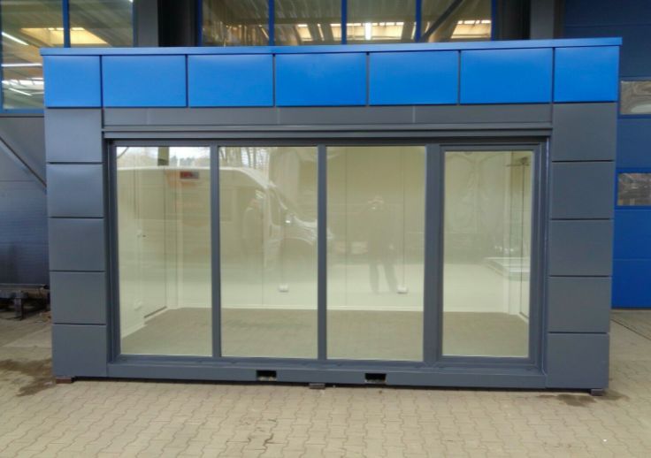 Bürocontaineranlage Modell ,,Wien'' mit Außenmaßen 6,00 m (vorn ) x 5,00 m (Seitenwand) und einer Innenhöhe von 2,50 Meter. Der Bürocontainer ist aus Sandwichelementen gefertigt mit einem 150 mm dicken Polystyrolkern und 120 mm starken Isolierboden. Das Dach ist ebenfalls aus Sandwichplatten mit ein