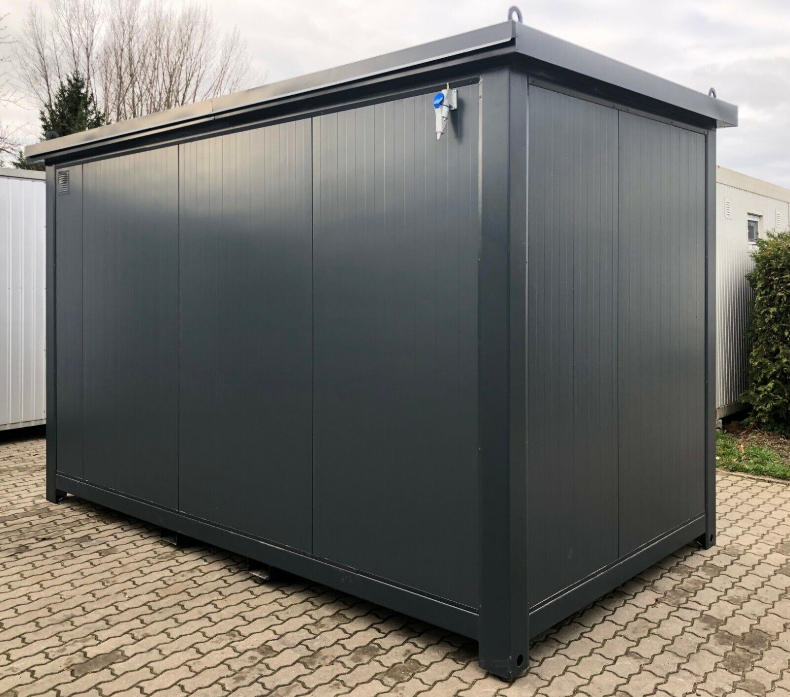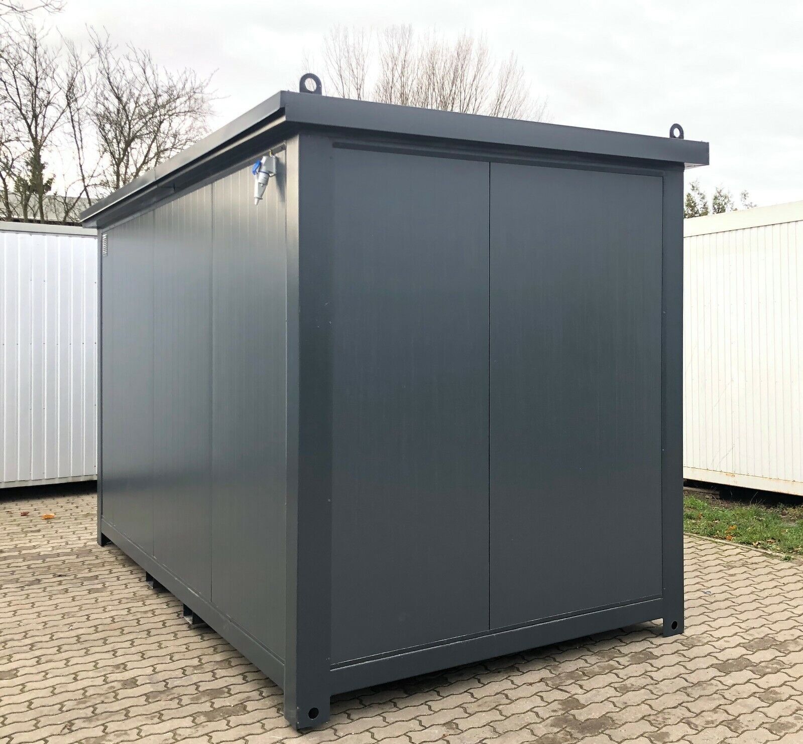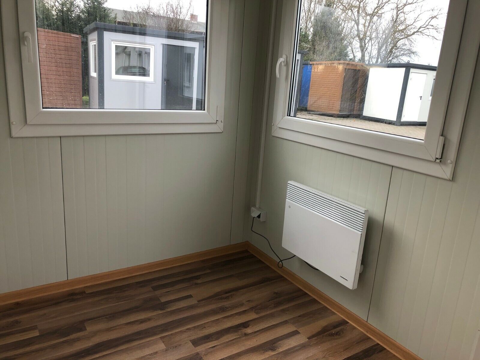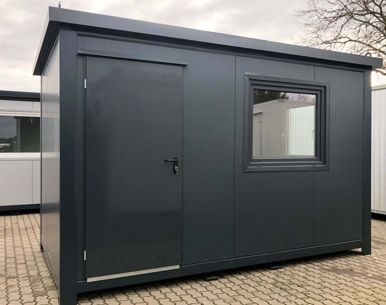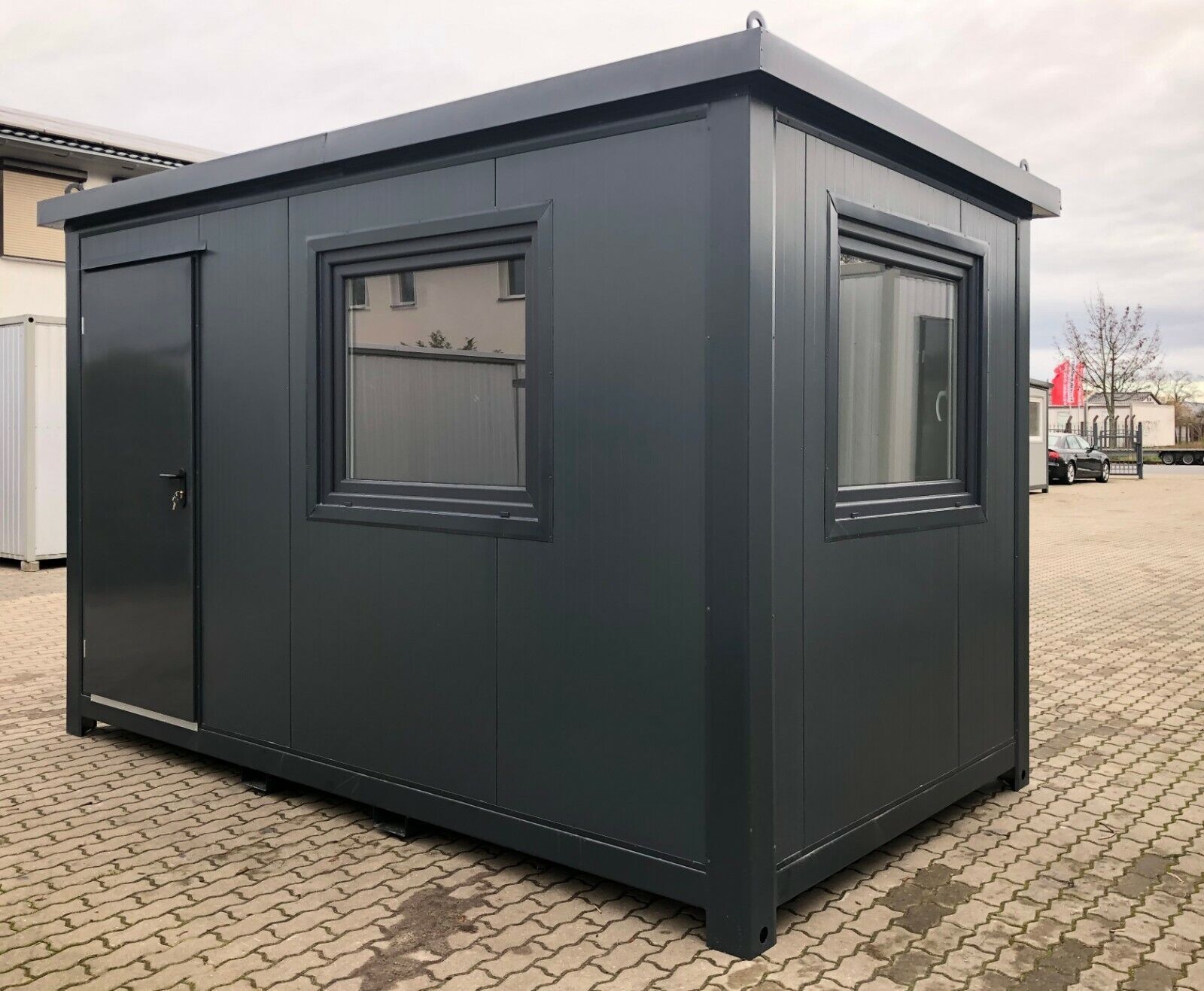 Bürocontainer 4,00 x 2,40 Meter, 2,70 Meter hoch. -Wände u. Dach Sandwichelemente 7,5cm Isolierung. - 2 Fenster Dreh Kipp (Doppelverglasung) - Wärmegedämmtes Sandwichprofil für geringen Energieverlust - Hörmann Stahlblech Außentür - Komplette Elektroinstallation nach EG Richtlinien - Steckdosen 230V