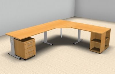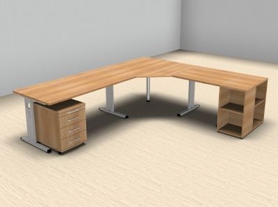 Schreibtischkombination mit Rollcontainer und Anstellcontainer bestehend aus einem Schreibtisch 160 cm, einem Schreibtisch 80 cm, einer Verkettungsplatte Trapez einem Rollcontainer mit 3 Schubladen und einem Anstellcontainer. Dekorfarben in Ahorn Buche Lichtgrau oder Nussbaum.