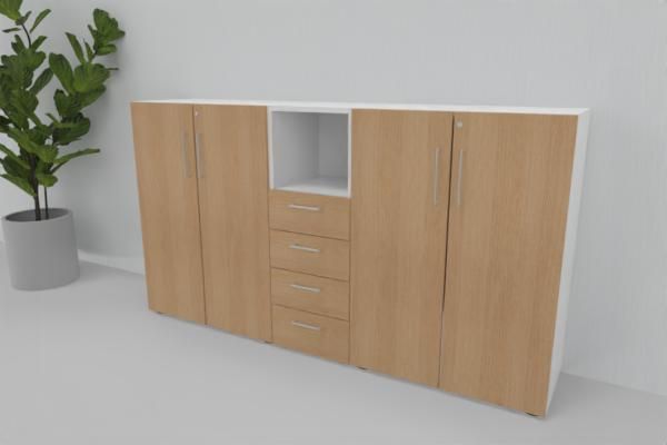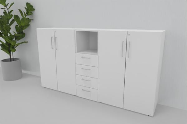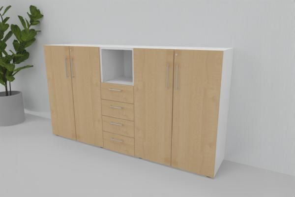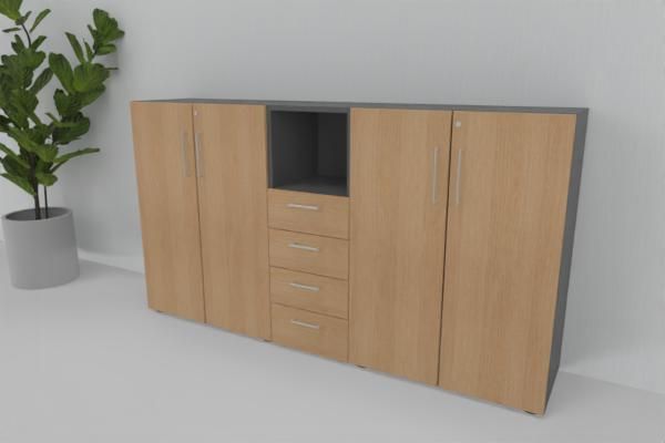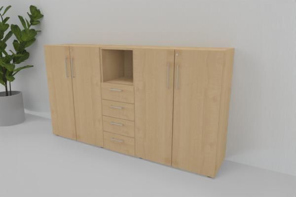 Büro Schrankwand VH3, Gesamtbreite 200 cm, 3 Ordnerhöhen bestehend aus 2 x Aktenschrank 80 x 41,7 x 110 cm (B x T x H) und 1 Schubladenschrank 3 Ordnerhöhen mit 4 Schubfächern und einem offenen Regalfach 40 x 41,7 x 110 cm (B x T x H)
