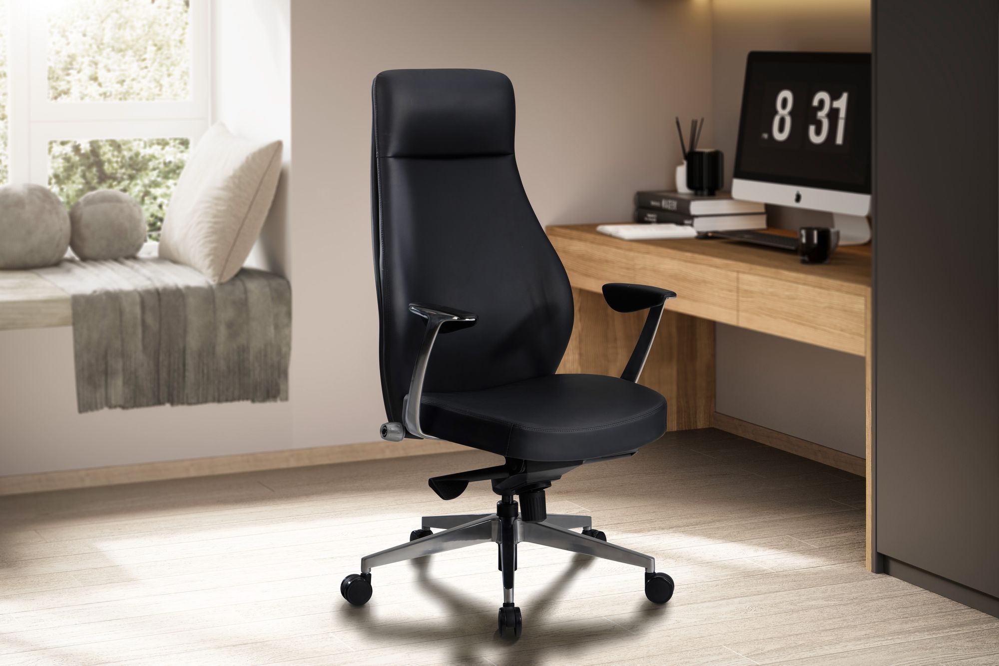 FineBuy Bürostuhl Kunstleder-Bezug Schreibtischstuhl bis 120 kg, Design Chefsessel höhenverstellbar, Drehstuhl ergonomisch mit Armlehnen & hoher Rückenlehne, Wippfunktion