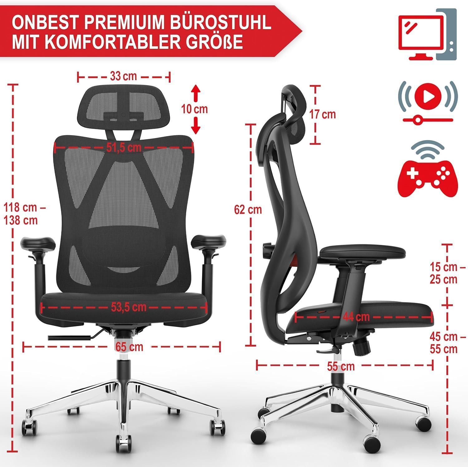 Bürostuhl »Monaco« Der ergonomische Premium Bürostuhl ist die perfekte Wahl für deutsche Büros und überzeugt durch seine optimale Rückenstützfunktion. Ausgestattet mit einer individuell verstellbaren Lordosenstütze, verstellbaren Armlehnen und einer verstellbaren Kopfstütze bietet dieser Bürostuhl h