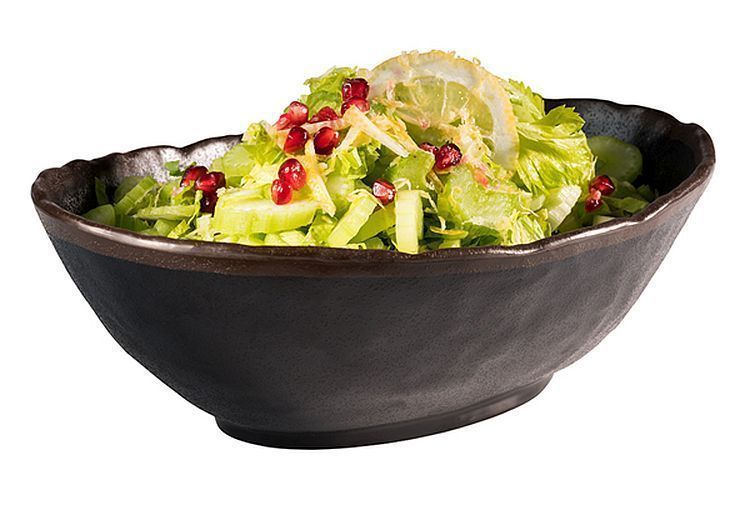 Schale 84733 Ausführung: aus Melamin Farbe: schwarz / brauner Rand sehr harte Oberfläche stoß- & kratzfest säurebeständig Gebrauchstemperatur: -30° bis +70°C Kapazität: 1,40 Liter stapelbar spülmaschinengeeignet Maße (BxTxH): 275 x 190 x 90 mm