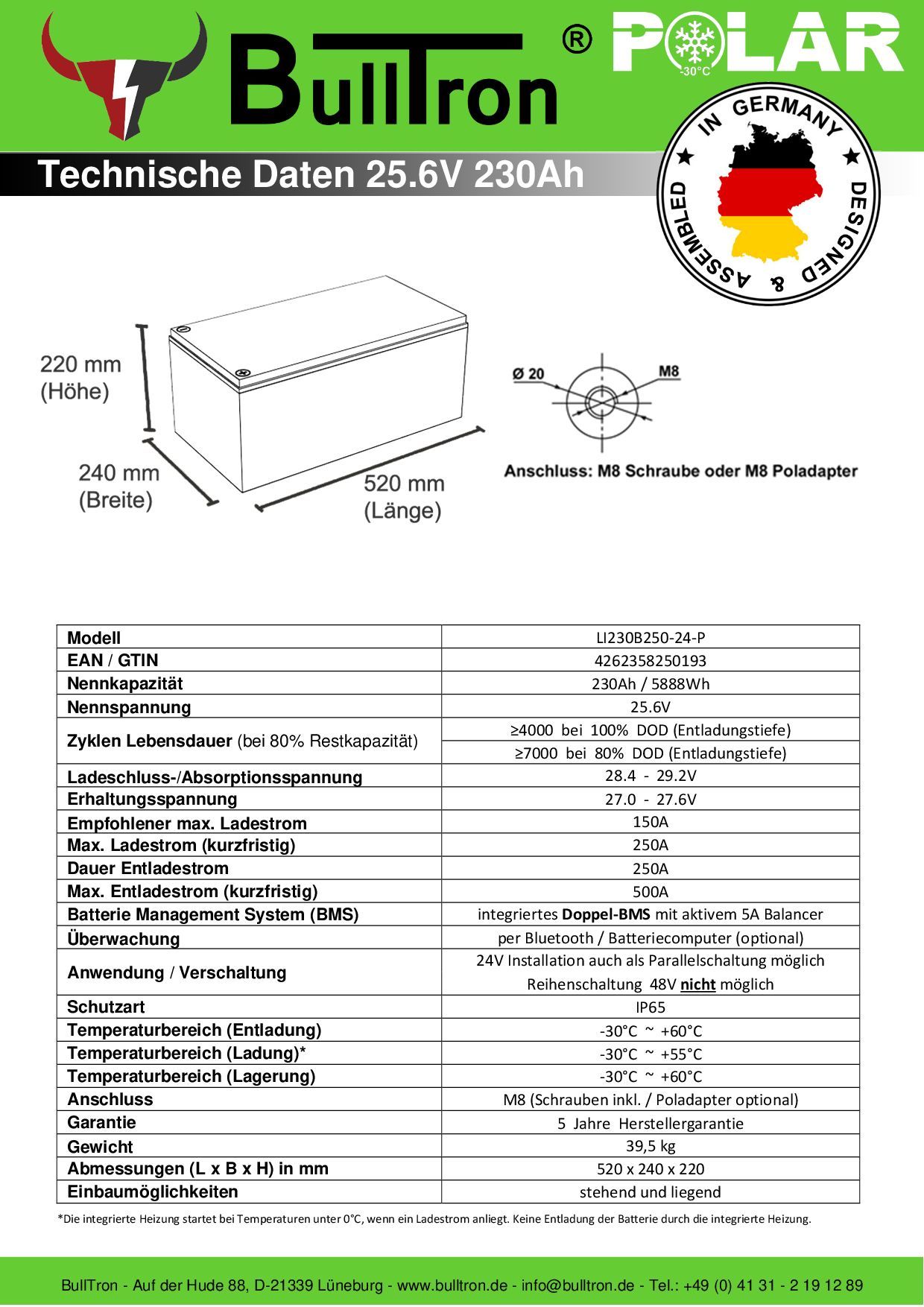 Bulltron 230Ah Polar LiFePO4 25.6V Akku mit Smart Doppel-BMS, Bluetooth App u