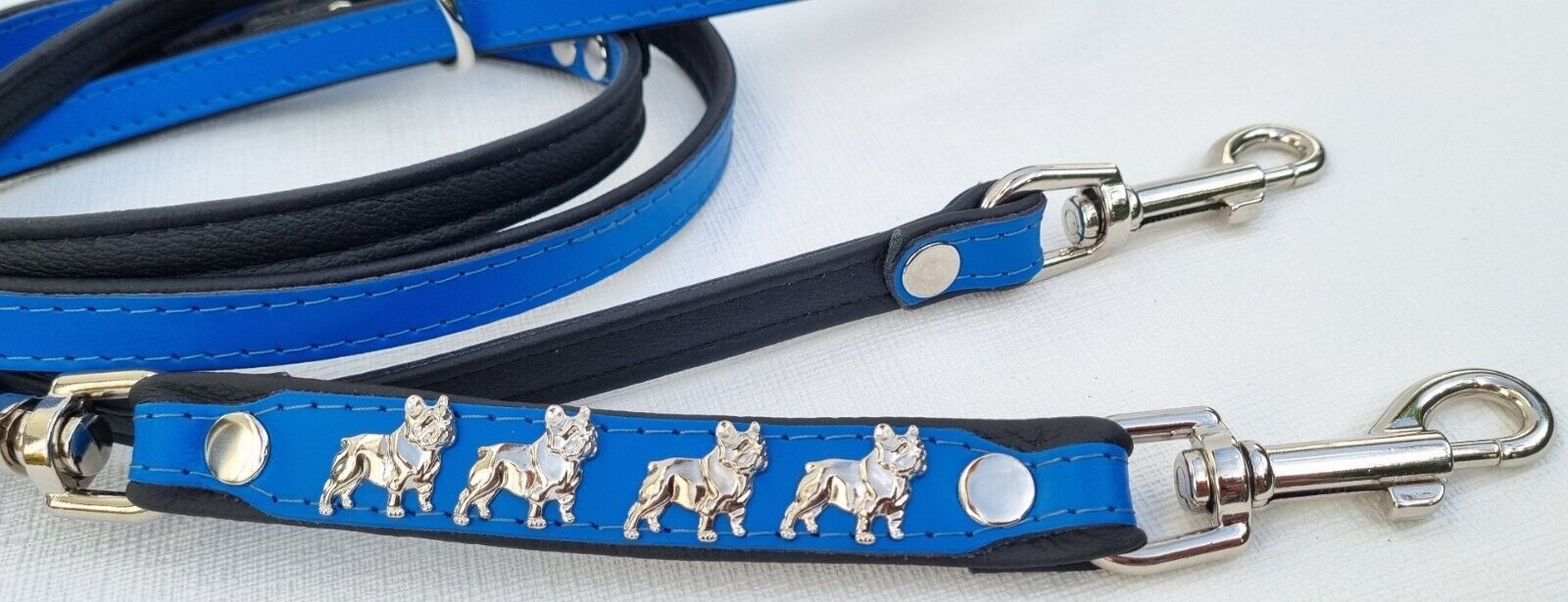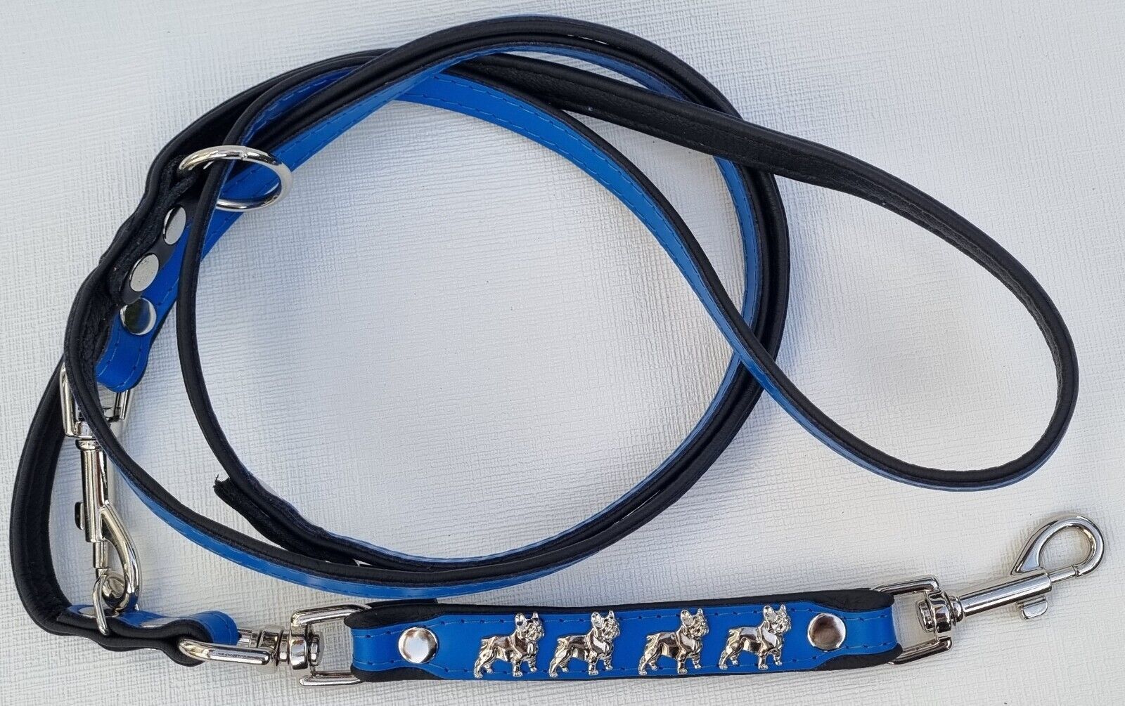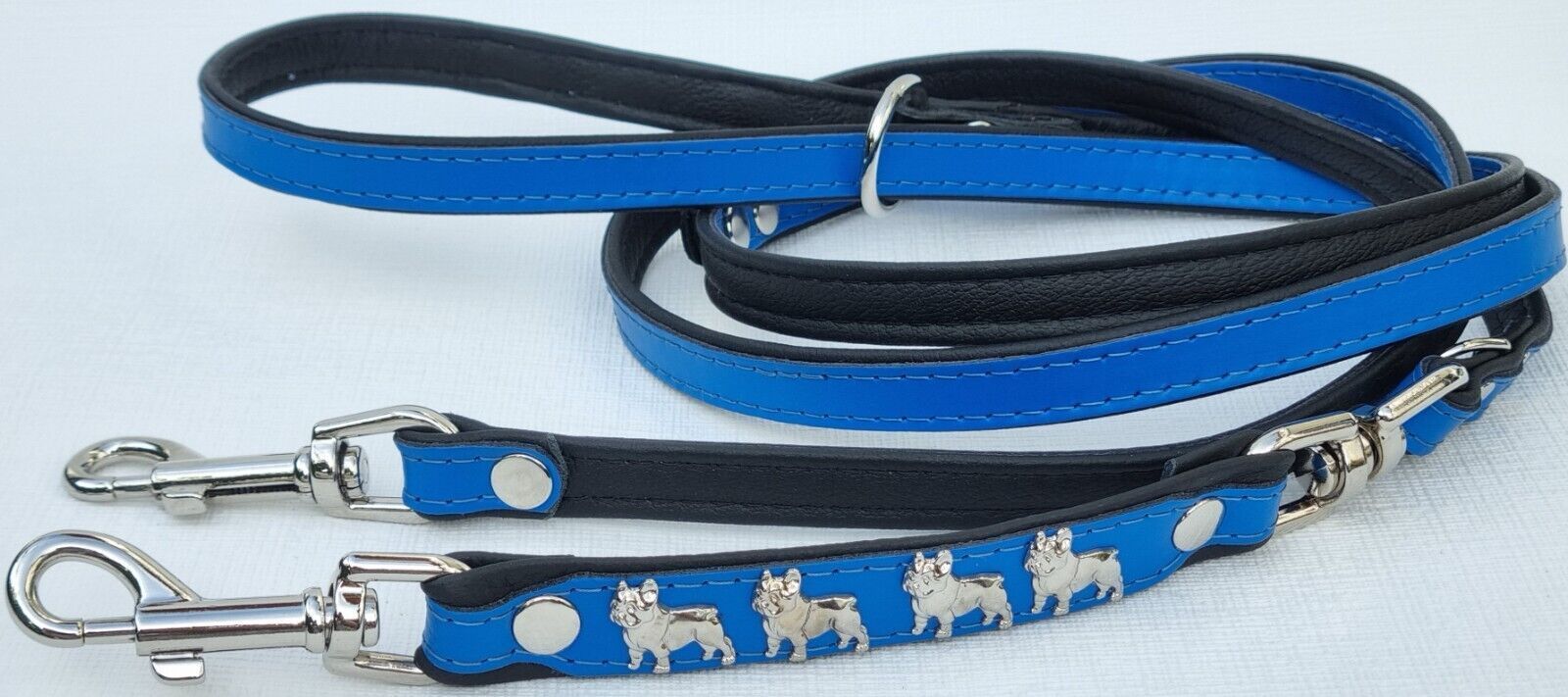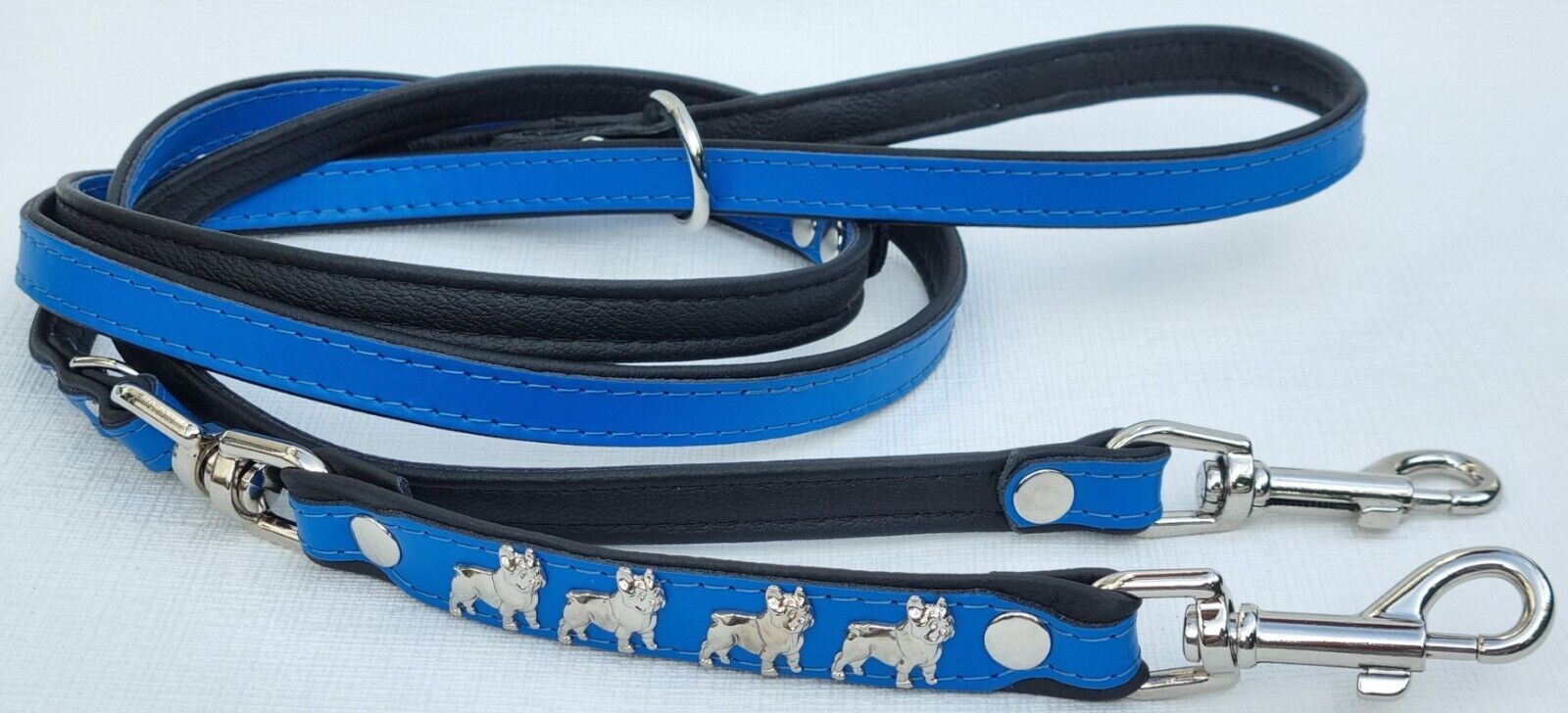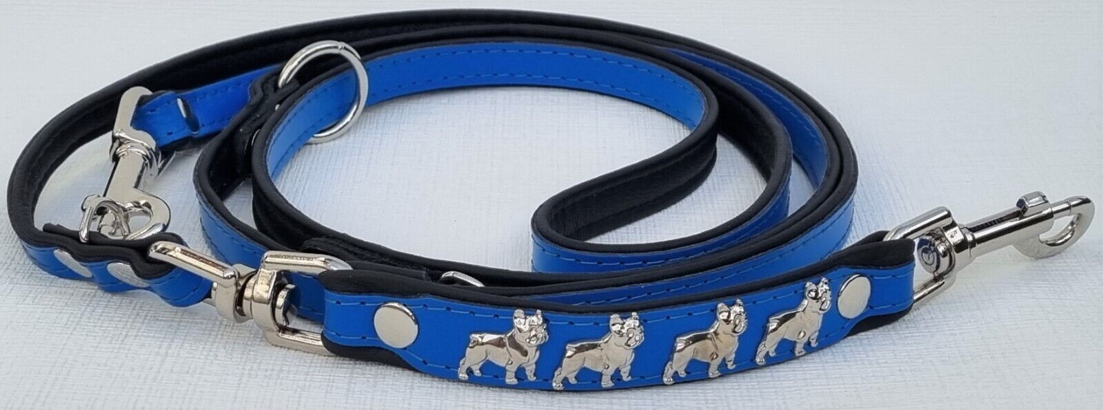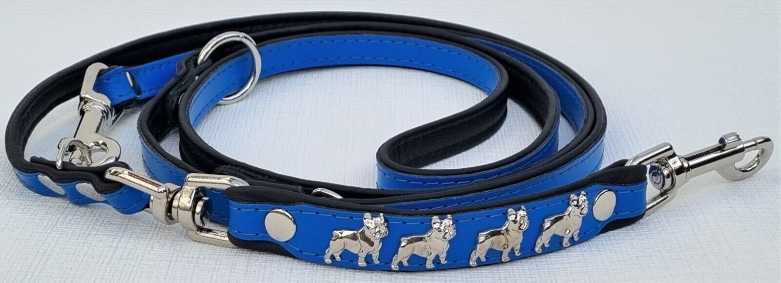 *** Bully Französische Bulldogge French Bulldog Frenchie *** LEDERFÜHRLEINE mit tollen Metallaplikationen *** BLAU - Schwarz *** 3 x verstellbar Maße: Gesamtlänge : 220 cm Breit : 15 mm - bis 20mm verstellbar auf : 135cm; 175cm; 220cm Material - 100% hochwertiges Leder, sehr robust - Verziert mit 4