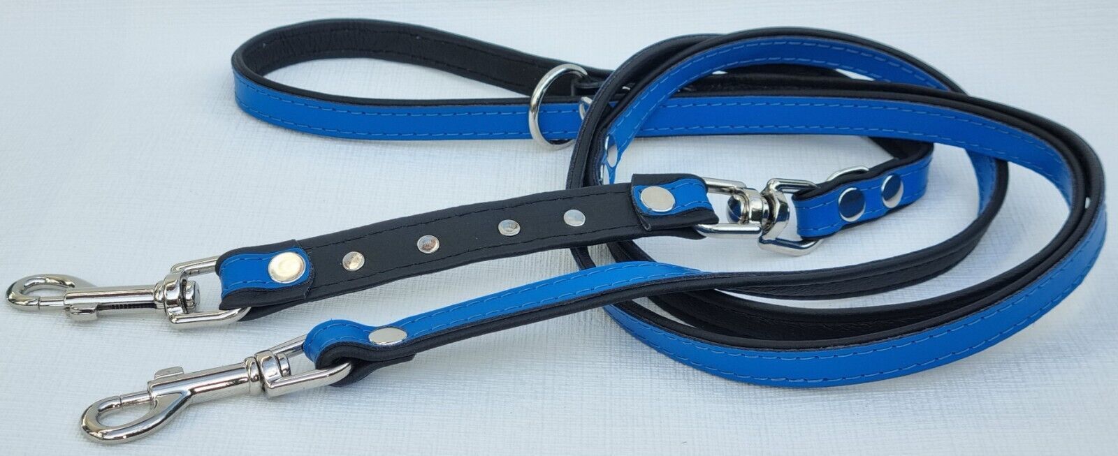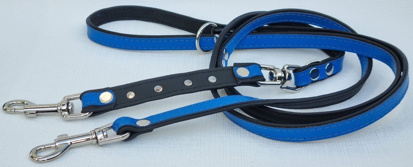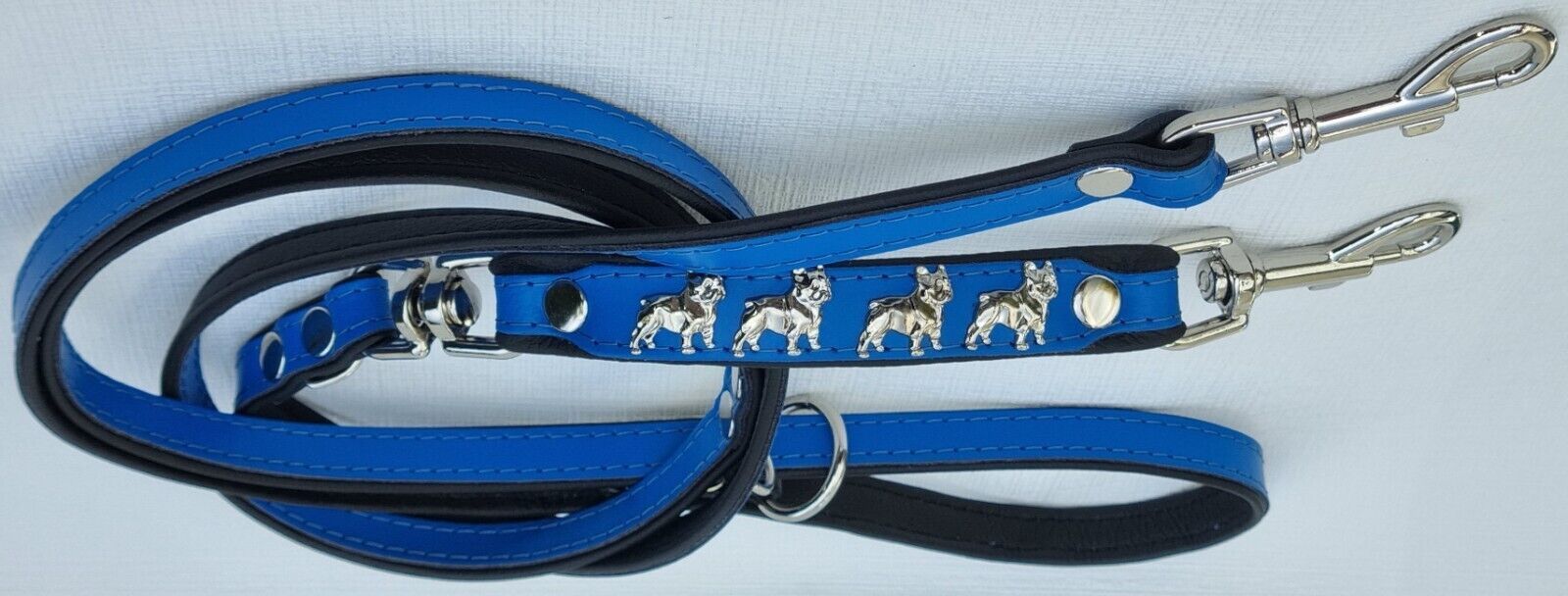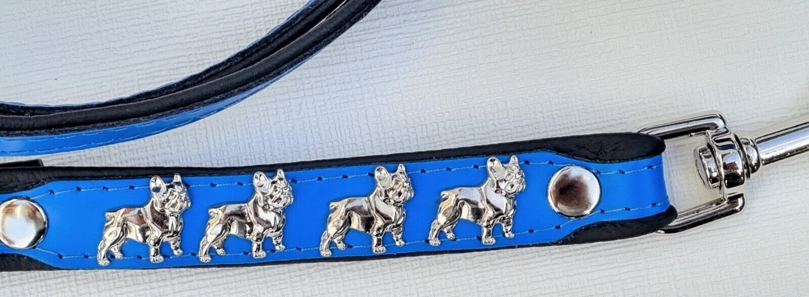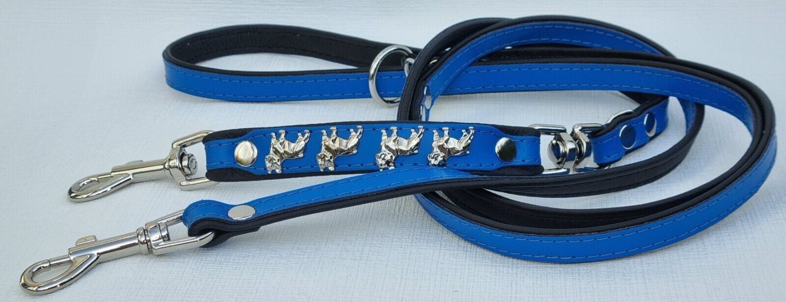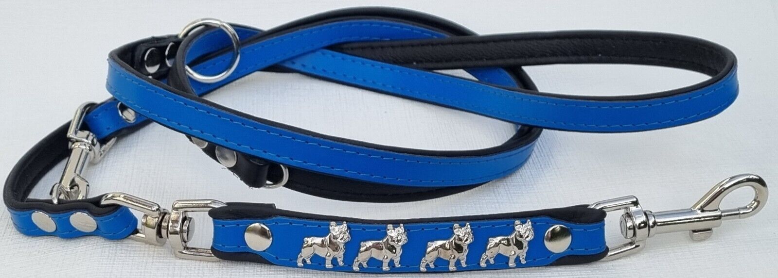 *** Bully Französische Bulldogge French Bulldog Frenchie *** LEDERFÜHRLEINE mit tollen Metallaplikationen *** BLAU - Schwarz *** 3 x verstellbar Maße: Gesamtlänge : 220 cm Breit : 15 mm - bis 20mm verstellbar auf : 135cm; 175cm; 220cm Material - 100% hochwertiges Leder, sehr robust - Verziert mit 4