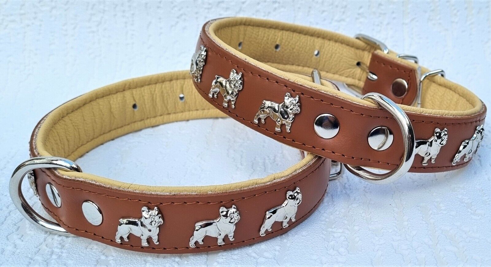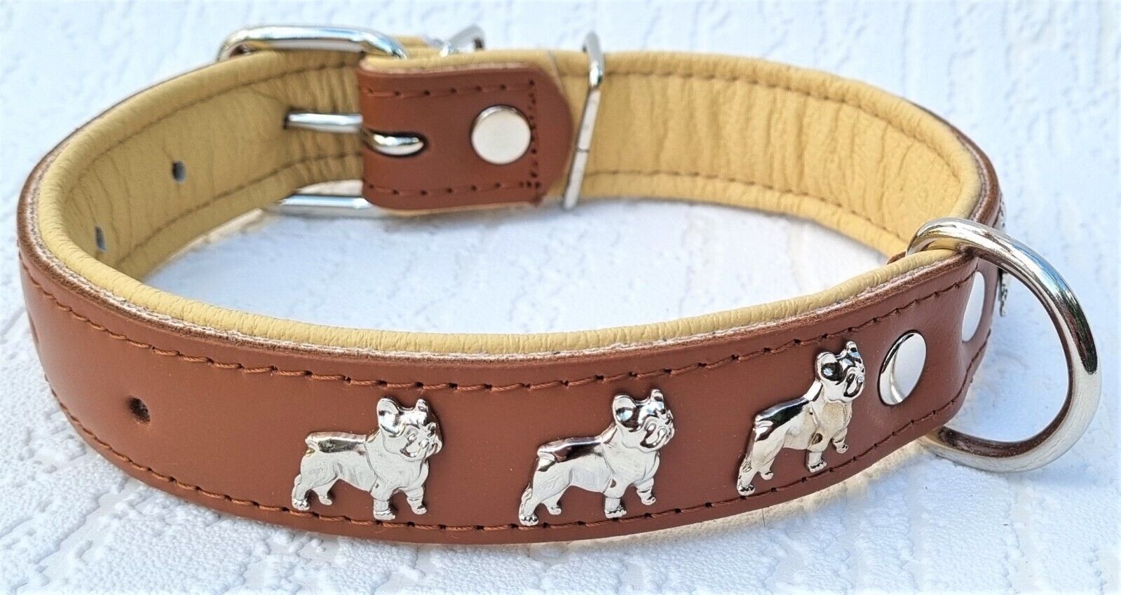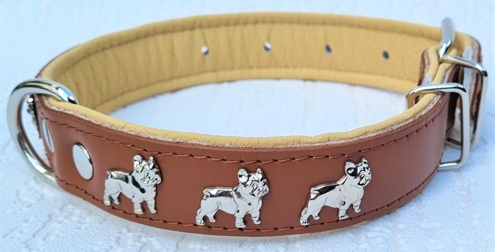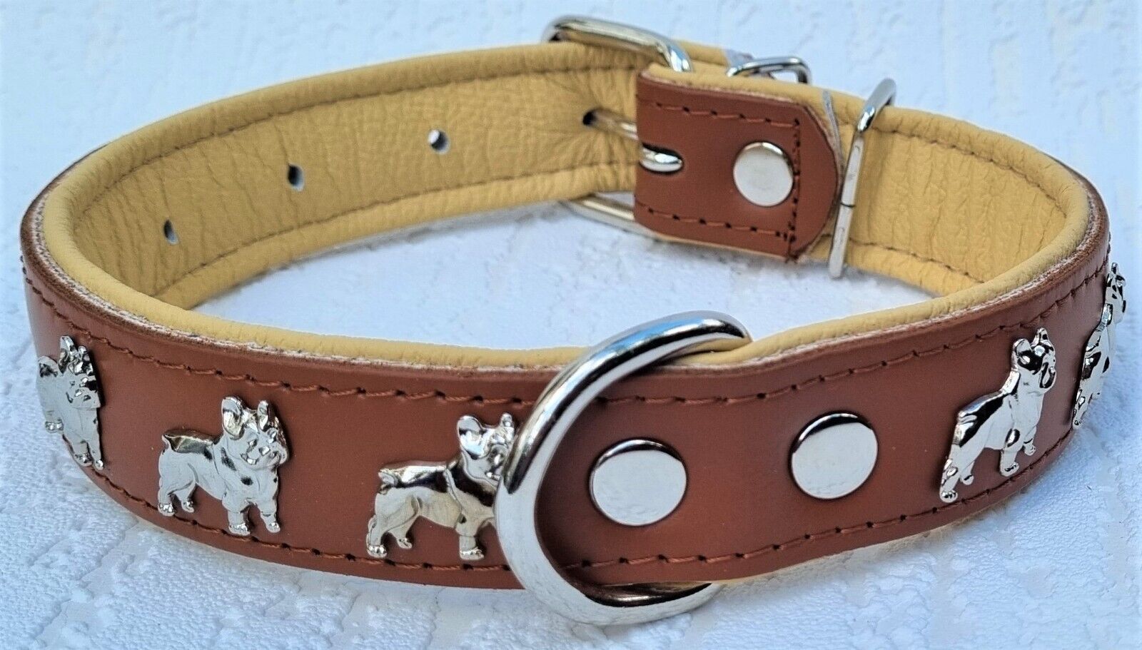 LEDERHALSBAND mit tollen Metallaplikationen * Bully - Französische Bulldogge Frenchie - French Bulldog * **** Cognac - Beige **** Maße: Gesamtlänge : 50 cm Halsumfang : 32 - 44cm (erste und letzte Loch) Breit : 30 mm Messen Sie hierzu bitte den Hals ihres Hundes . Material - 100% hochwertiges Leder,