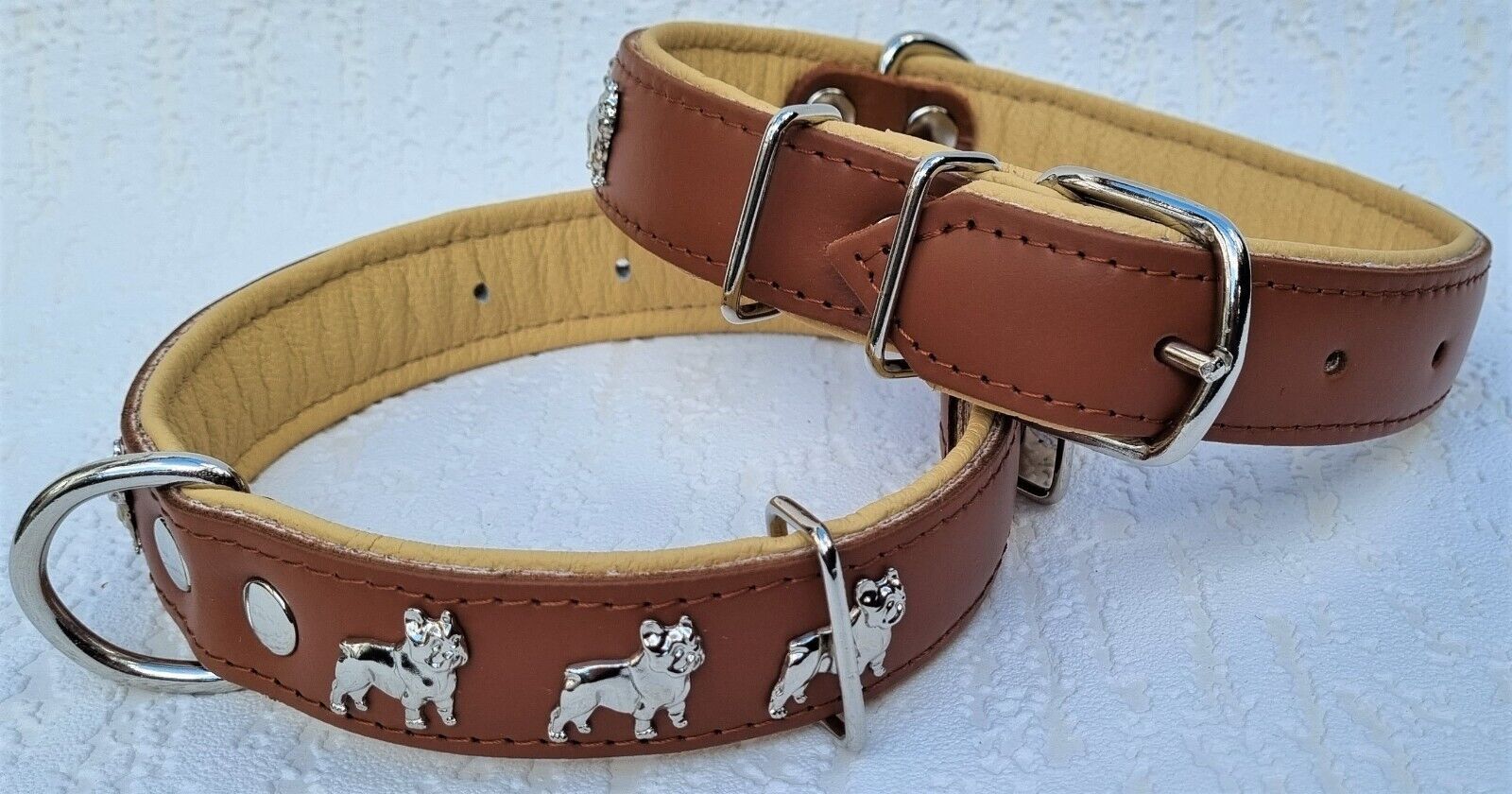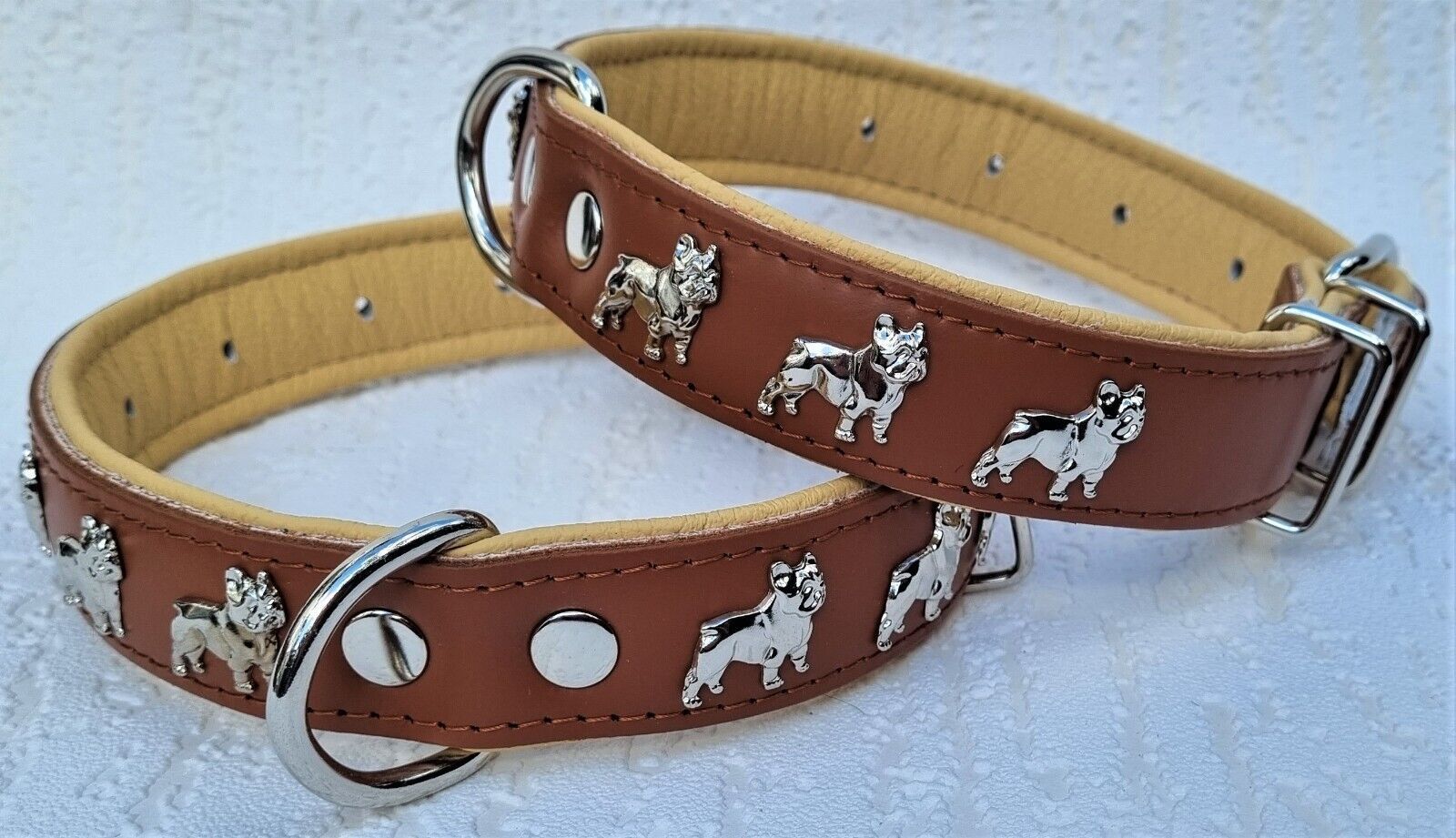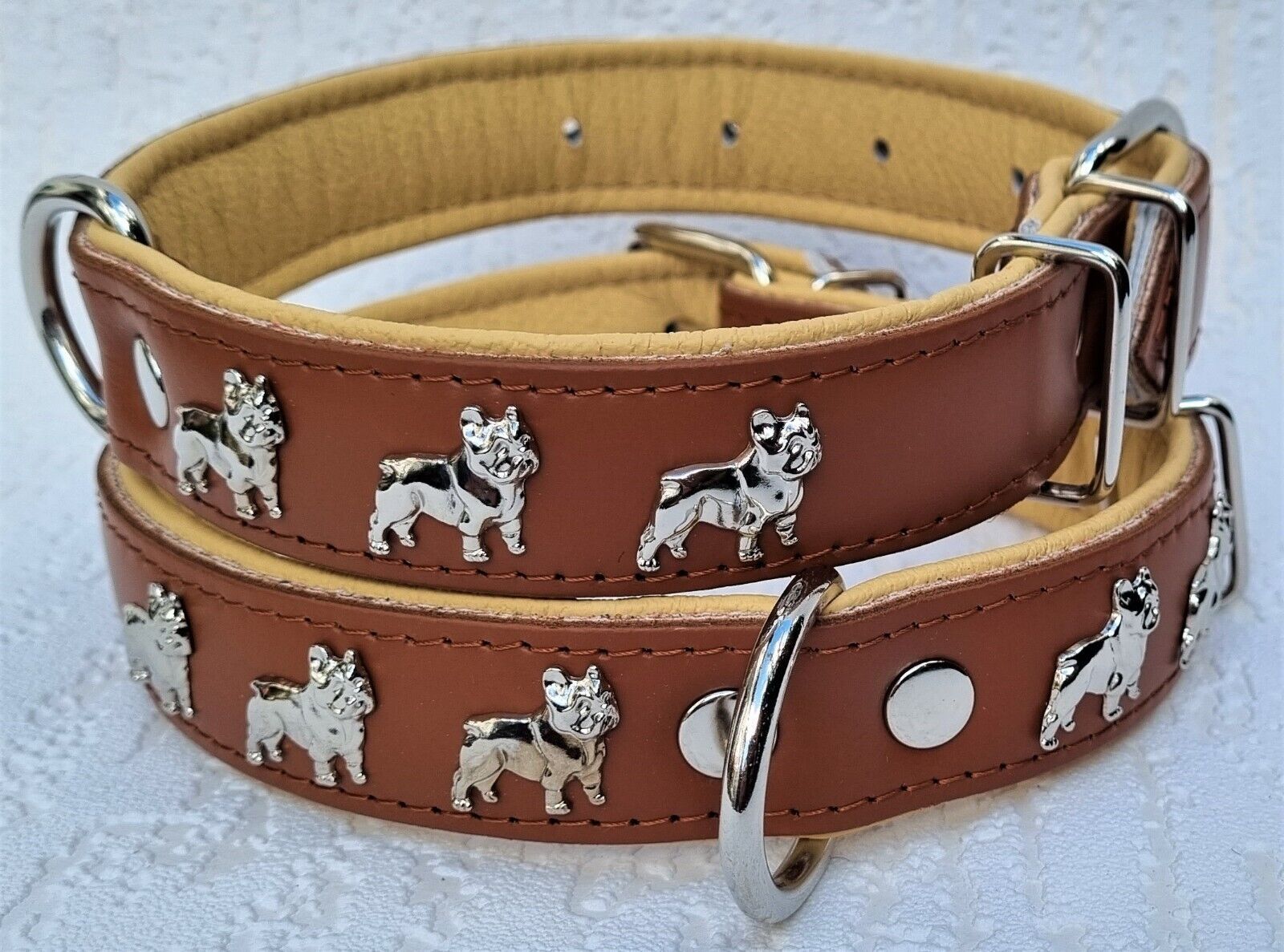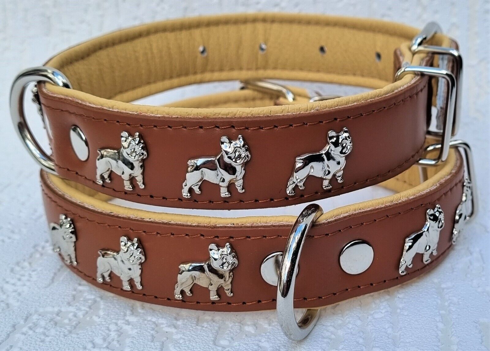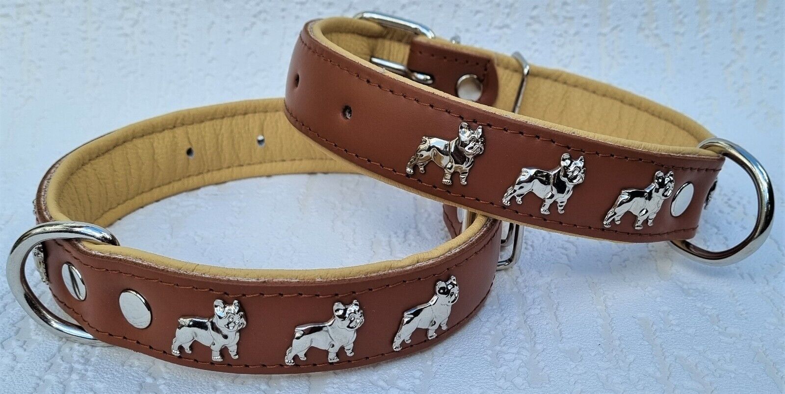 LEDERHALSBAND mit tollen Metallaplikationen * Bully - Französische Bulldogge Frenchie - French Bulldog * **** Cognac - Beige **** Maße: Gesamtlänge : 50 cm Halsumfang : 32 - 44cm (erste und letzte Loch) Breit : 30 mm Messen Sie hierzu bitte den Hals ihres Hundes . Material - 100% hochwertiges Leder,