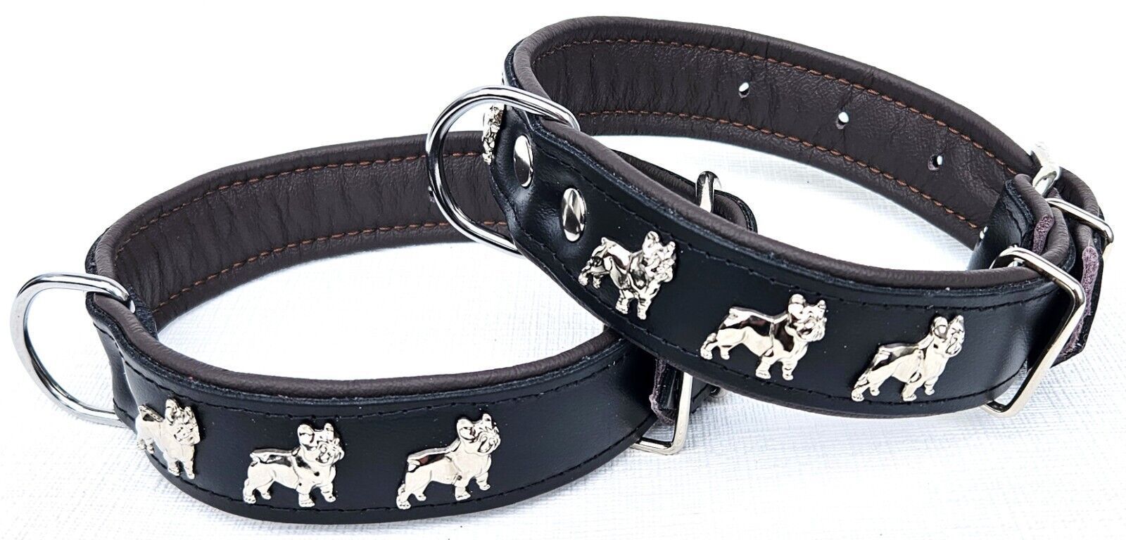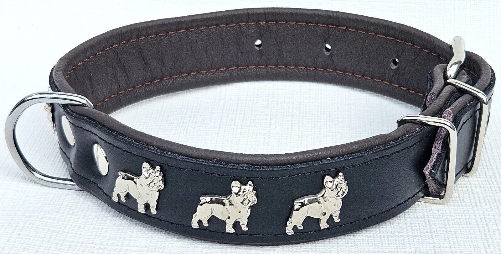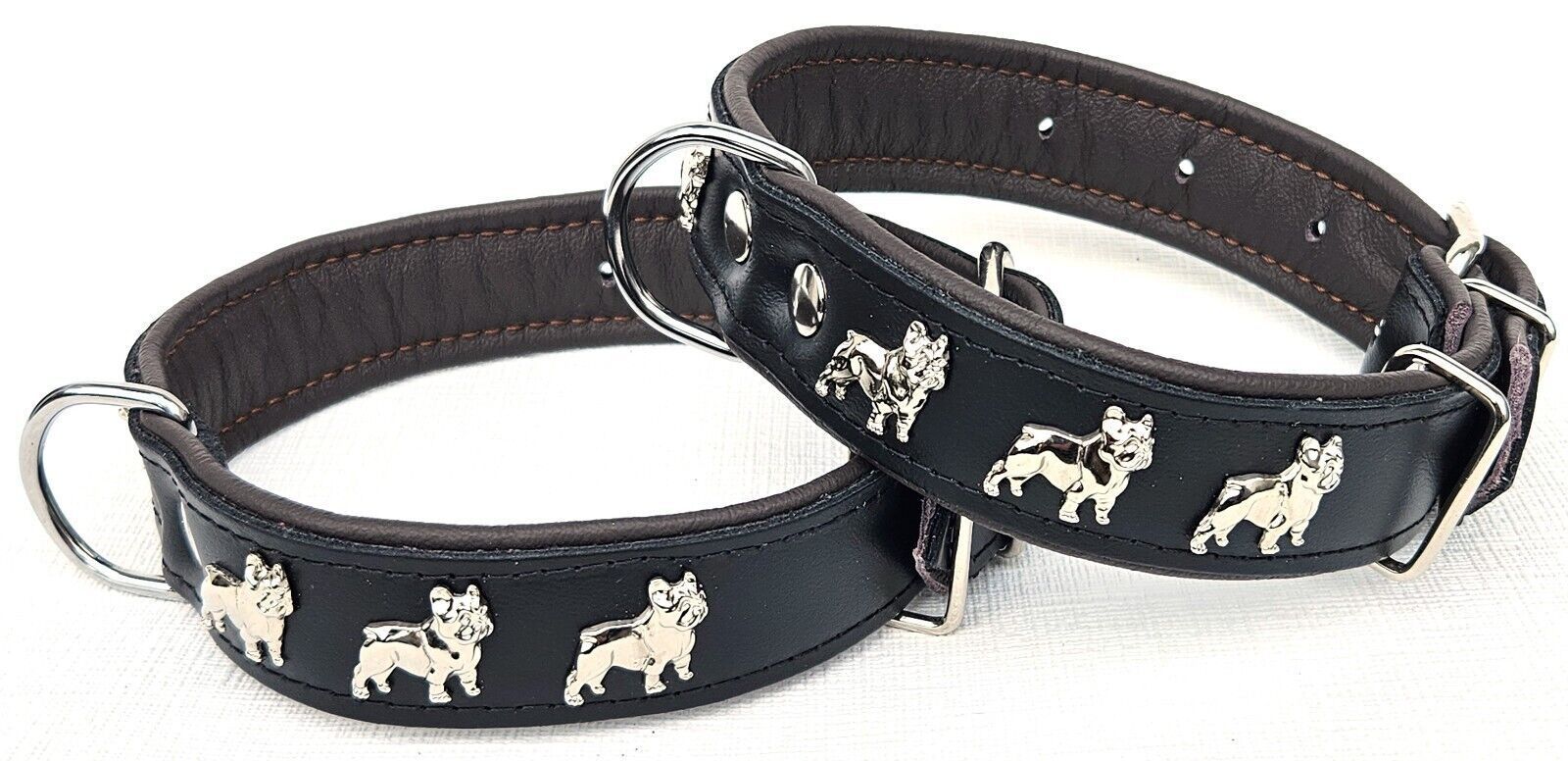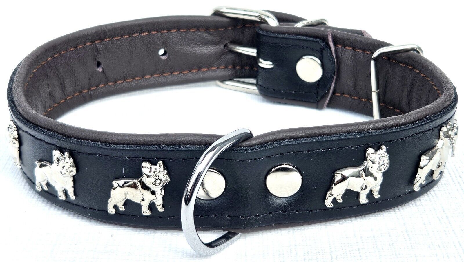 LEDERHALSBAND mit tollen Metallaplikationen * Bully - Französische Bulldogge Frenchie - French Bulldog * *** Schwarz - dunkel Braun *** Maße: Gesamtlänge : 51 cm Halsumfang : 34 - 46cm (erste und letzte Loch) Breit : 30 mm Messen Sie hierzu bitte den Hals ihres Hundes . Material - 100% hochwertiges