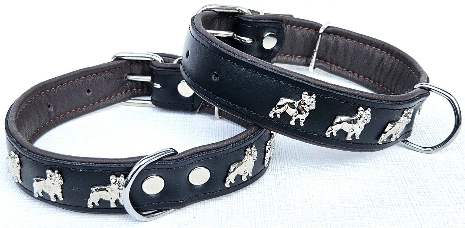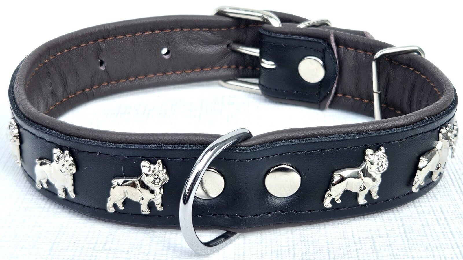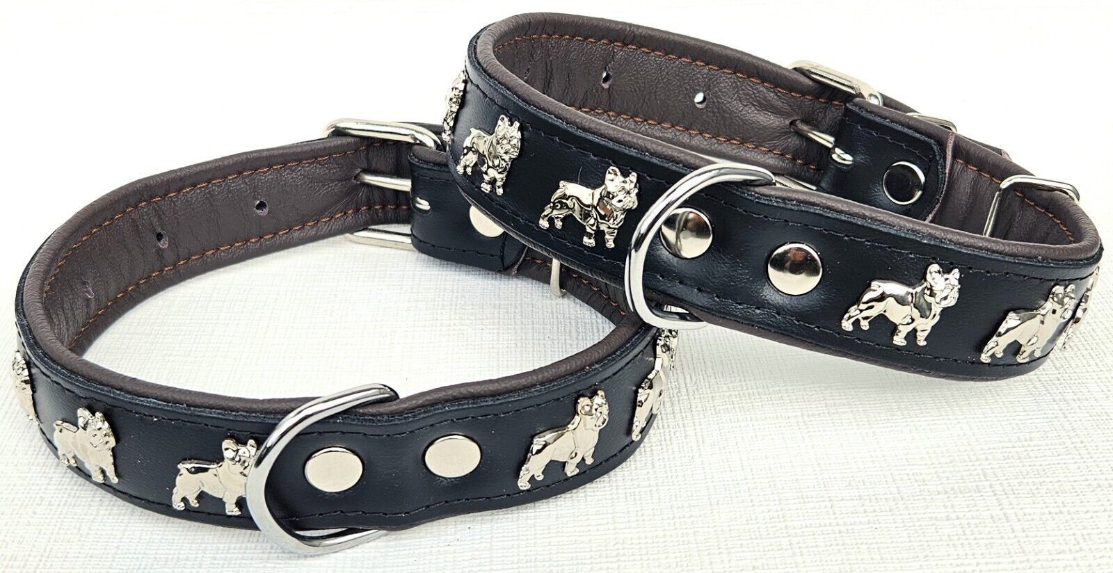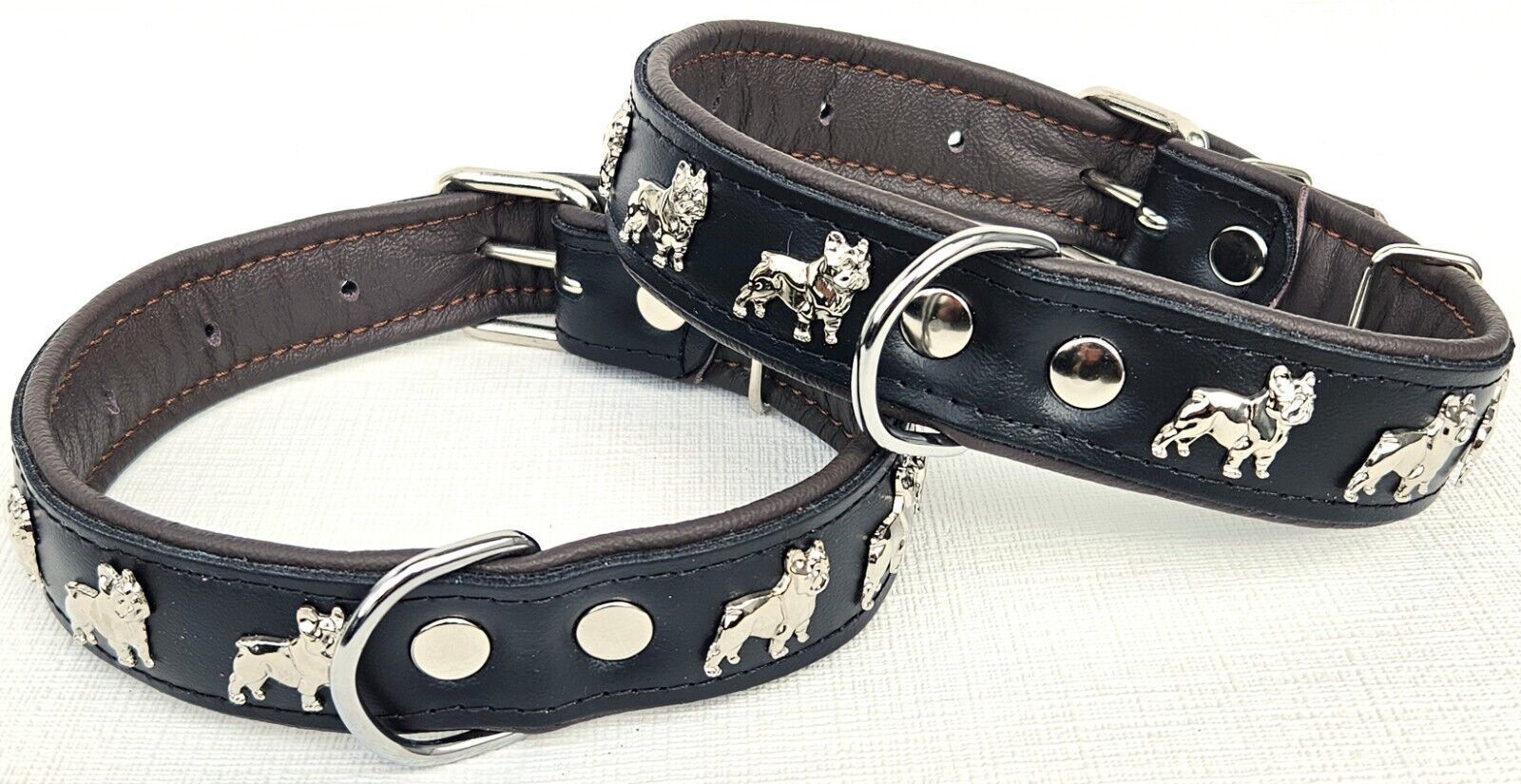 LEDERHALSBAND mit tollen Metallaplikationen * Bully - Französische Bulldogge Frenchie - French Bulldog * *** Schwarz - dunkel Braun *** Maße: Gesamtlänge : 51 cm Halsumfang : 34 - 46cm (erste und letzte Loch) Breit : 30 mm Messen Sie hierzu bitte den Hals ihres Hundes . Material - 100% hochwertiges