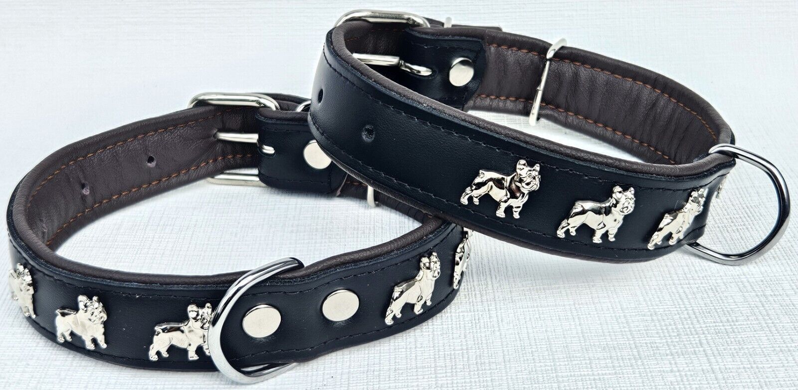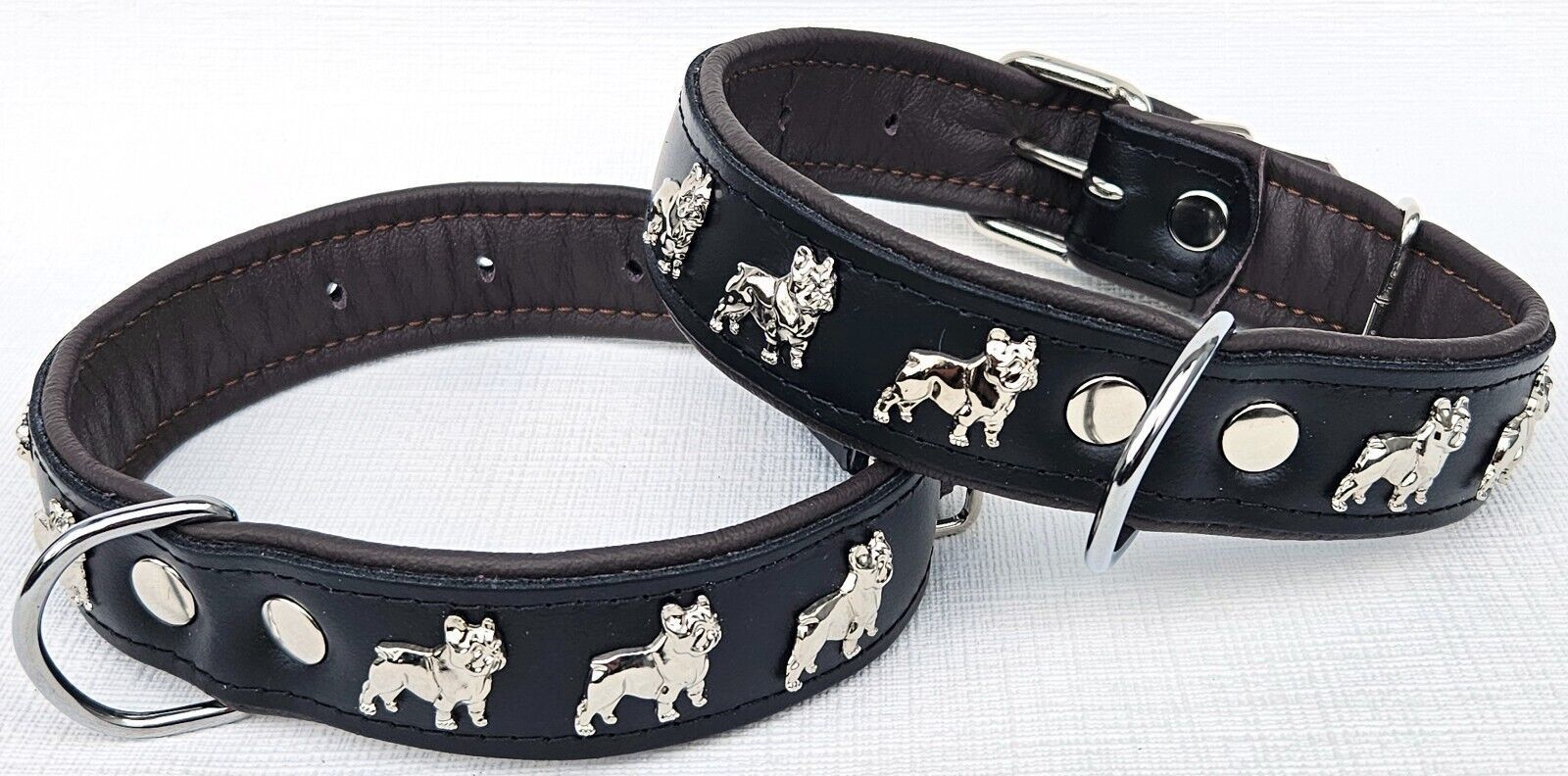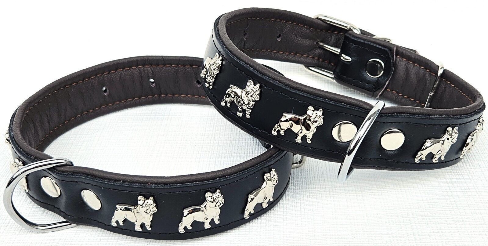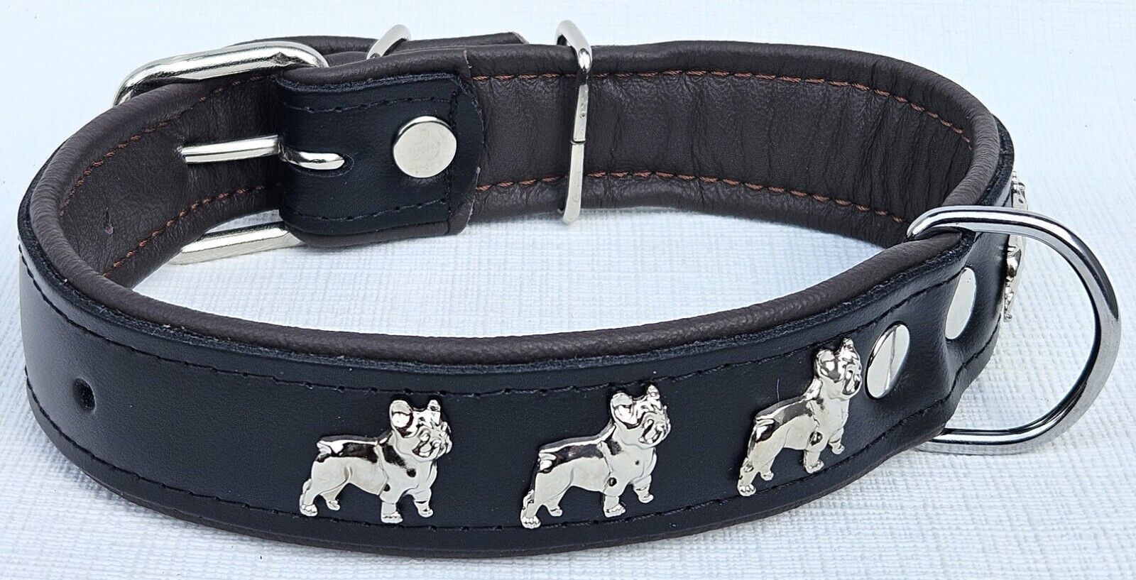 LEDERHALSBAND mit tollen Metallaplikationen * Bully - Französische Bulldogge Frenchie - French Bulldog * *** Schwarz - dunkel Braun *** Maße: Gesamtlänge : 51 cm Halsumfang : 34 - 46cm (erste und letzte Loch) Breit : 30 mm Messen Sie hierzu bitte den Hals ihres Hundes . Material - 100% hochwertiges