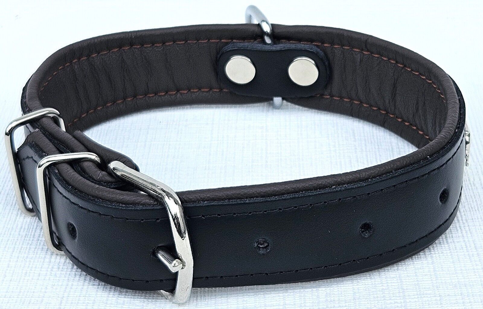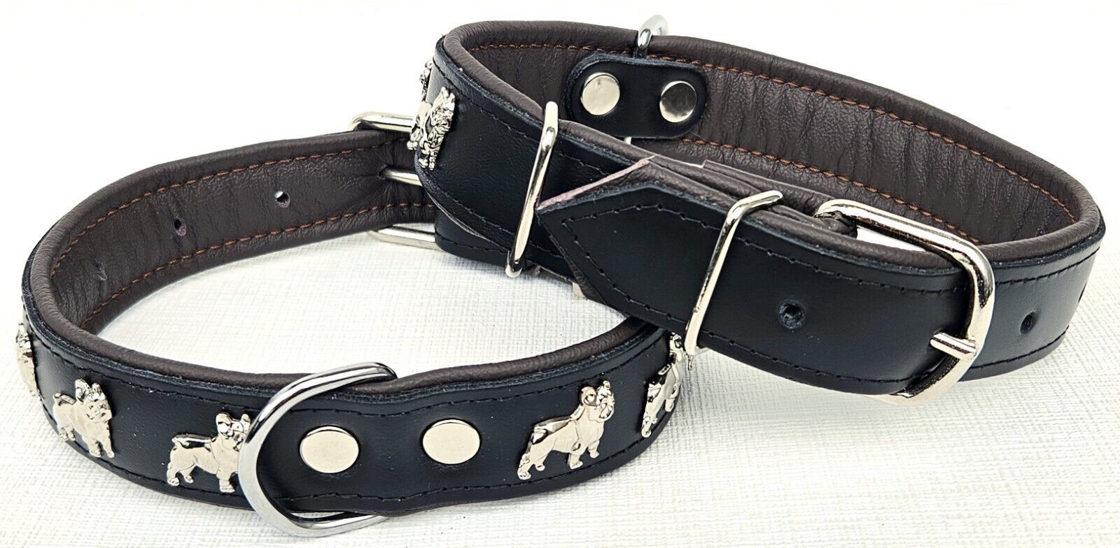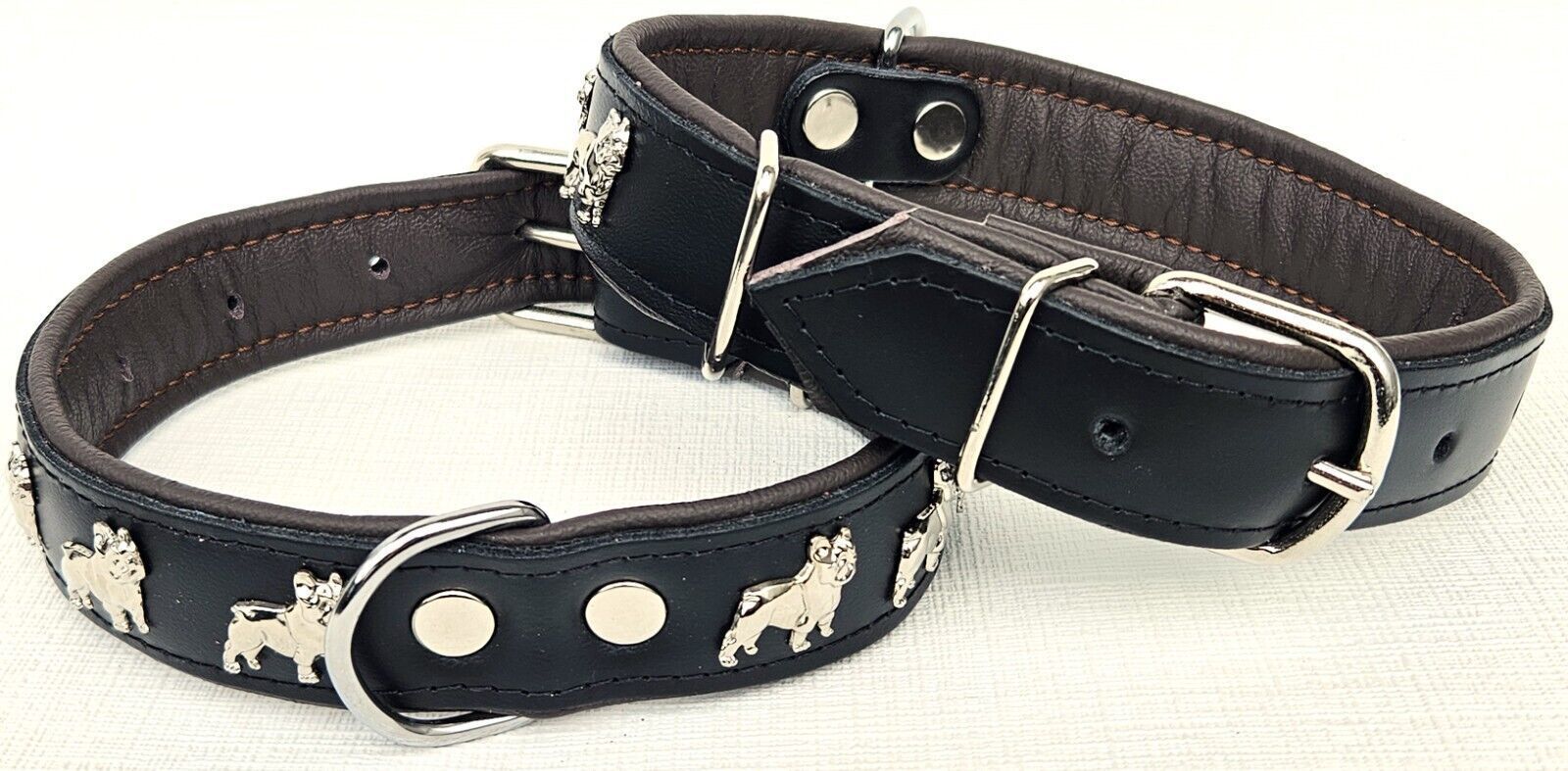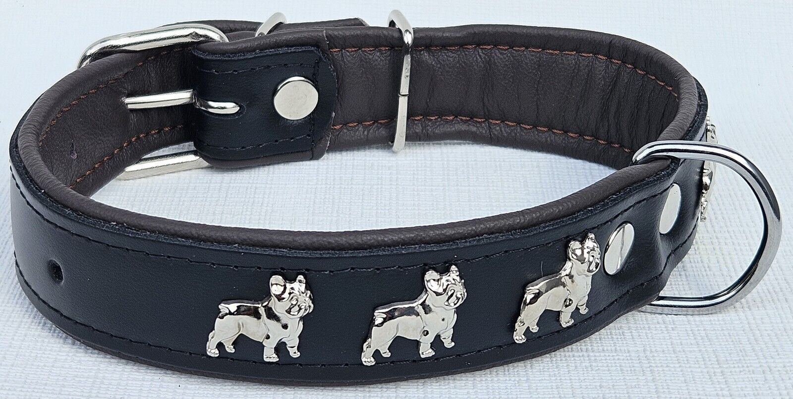 LEDERHALSBAND mit tollen Metallaplikationen * Bully - Französische Bulldogge Frenchie - French Bulldog * *** Schwarz - dunkel Braun *** Maße: Gesamtlänge : 51 cm Halsumfang : 34 - 46cm (erste und letzte Loch) Breit : 30 mm Messen Sie hierzu bitte den Hals ihres Hundes . Material - 100% hochwertiges