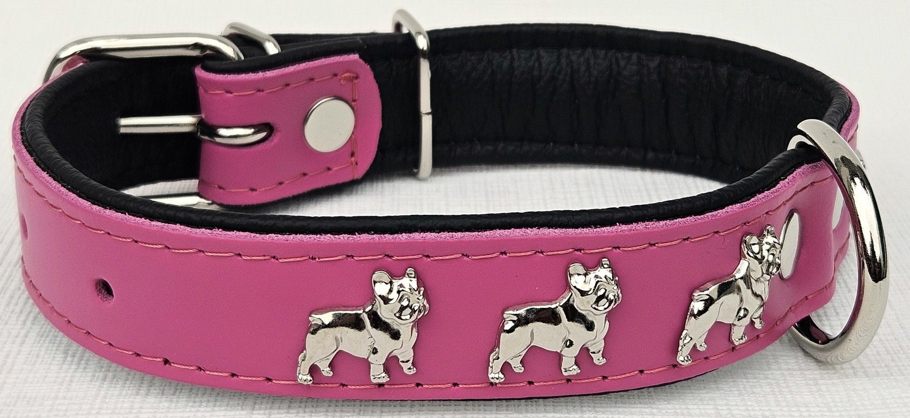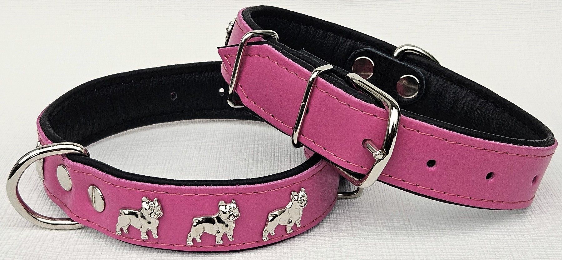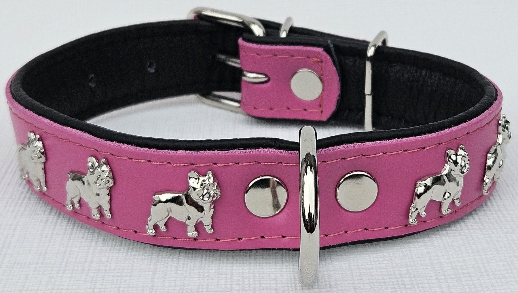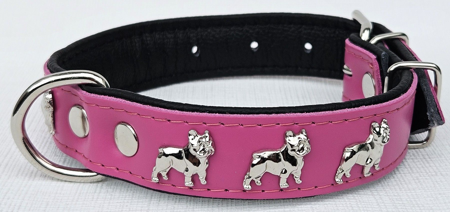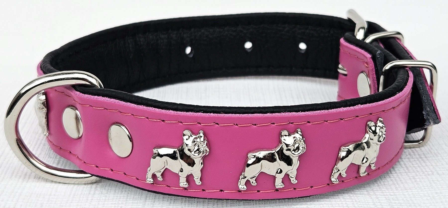 LEDERHALSBAND mit tollen Metallaplikationen * Bully - Französische Bulldogge Frenchie - French Bulldog * **** ROSA - Schwarz **** Maße: Gesamtlänge : 50 cm Halsumfang : 34 - 45cm (erste und letzte Loch) Breit : 30 mm Messen Sie hierzu bitte den Hals ihres Hundes . Material - 100% hochwertiges Leder,