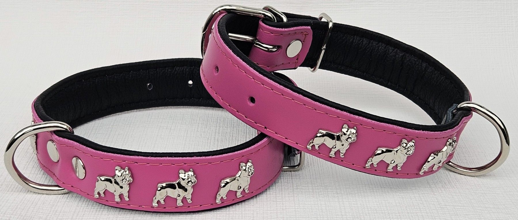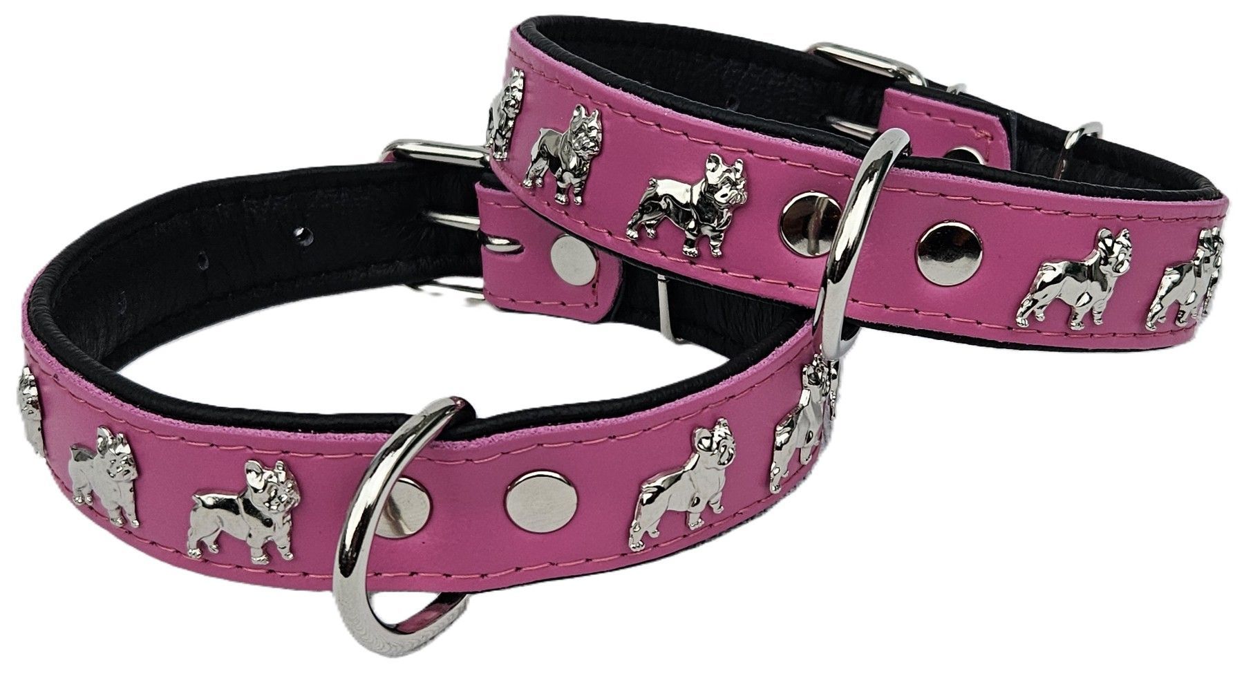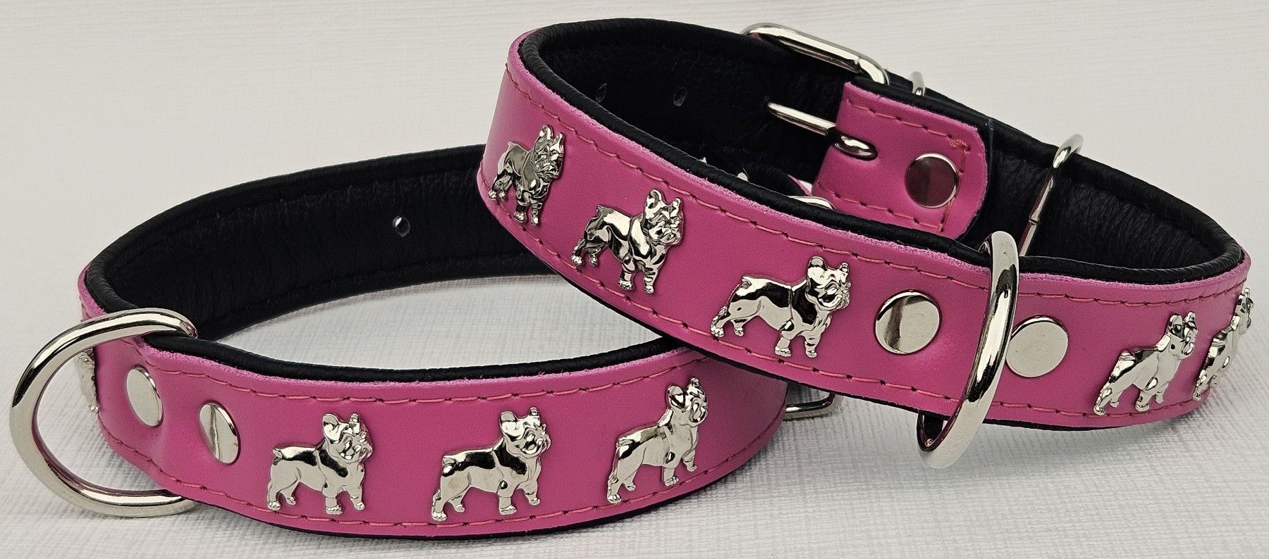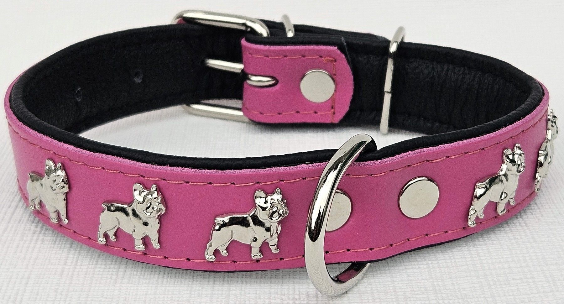 LEDERHALSBAND mit tollen Metallaplikationen * Bully - Französische Bulldogge Frenchie - French Bulldog * **** ROSA - Schwarz **** Maße: Gesamtlänge : 50 cm Halsumfang : 34 - 45cm (erste und letzte Loch) Breit : 30 mm Messen Sie hierzu bitte den Hals ihres Hundes . Material - 100% hochwertiges Leder,