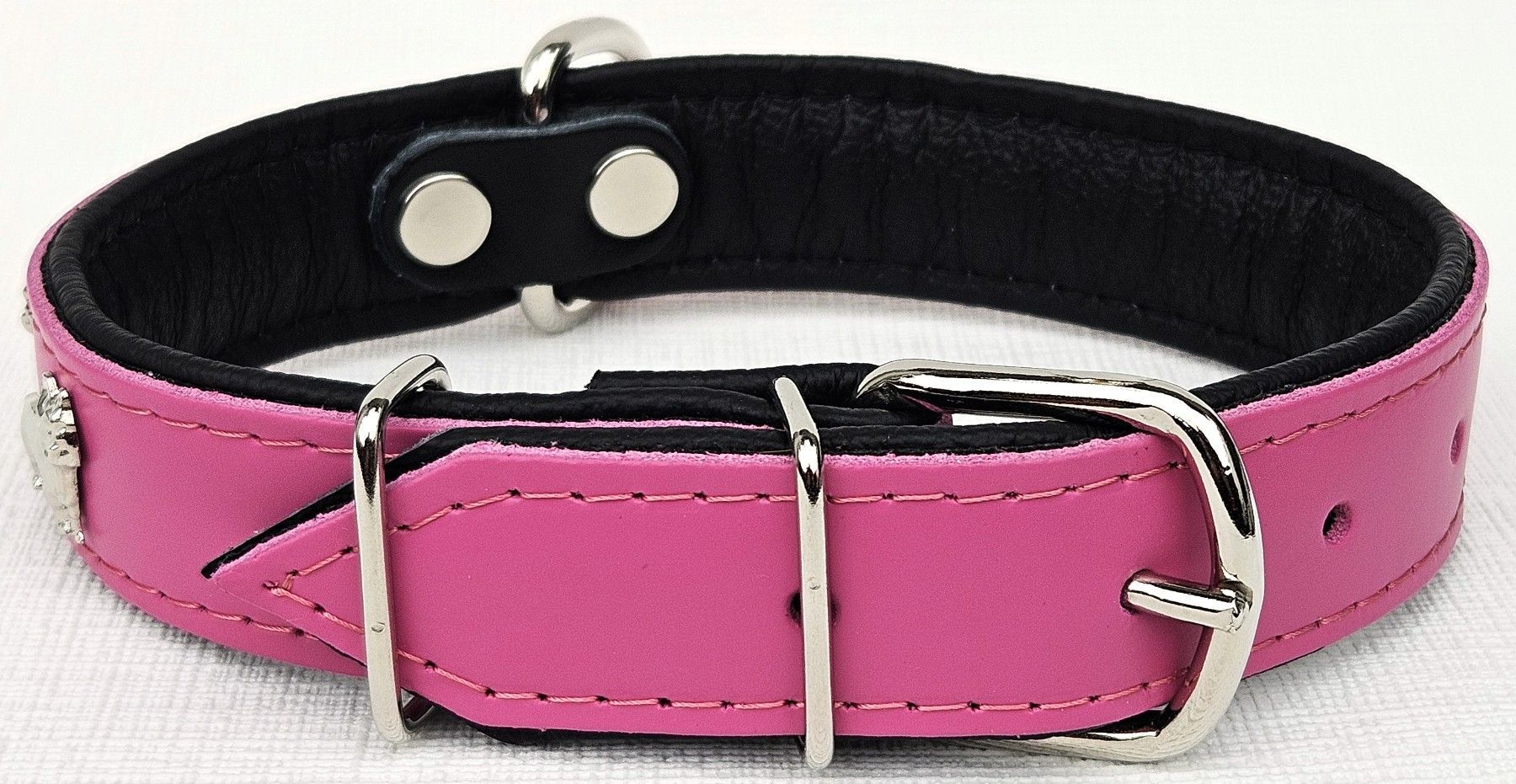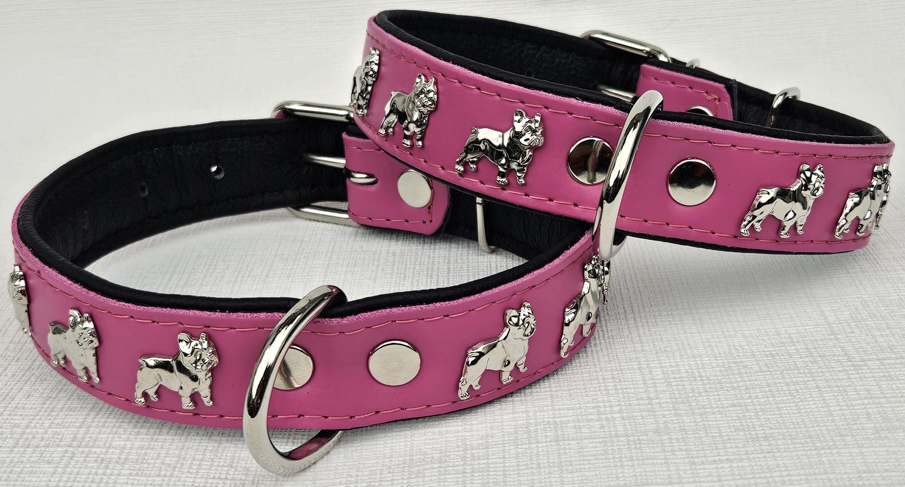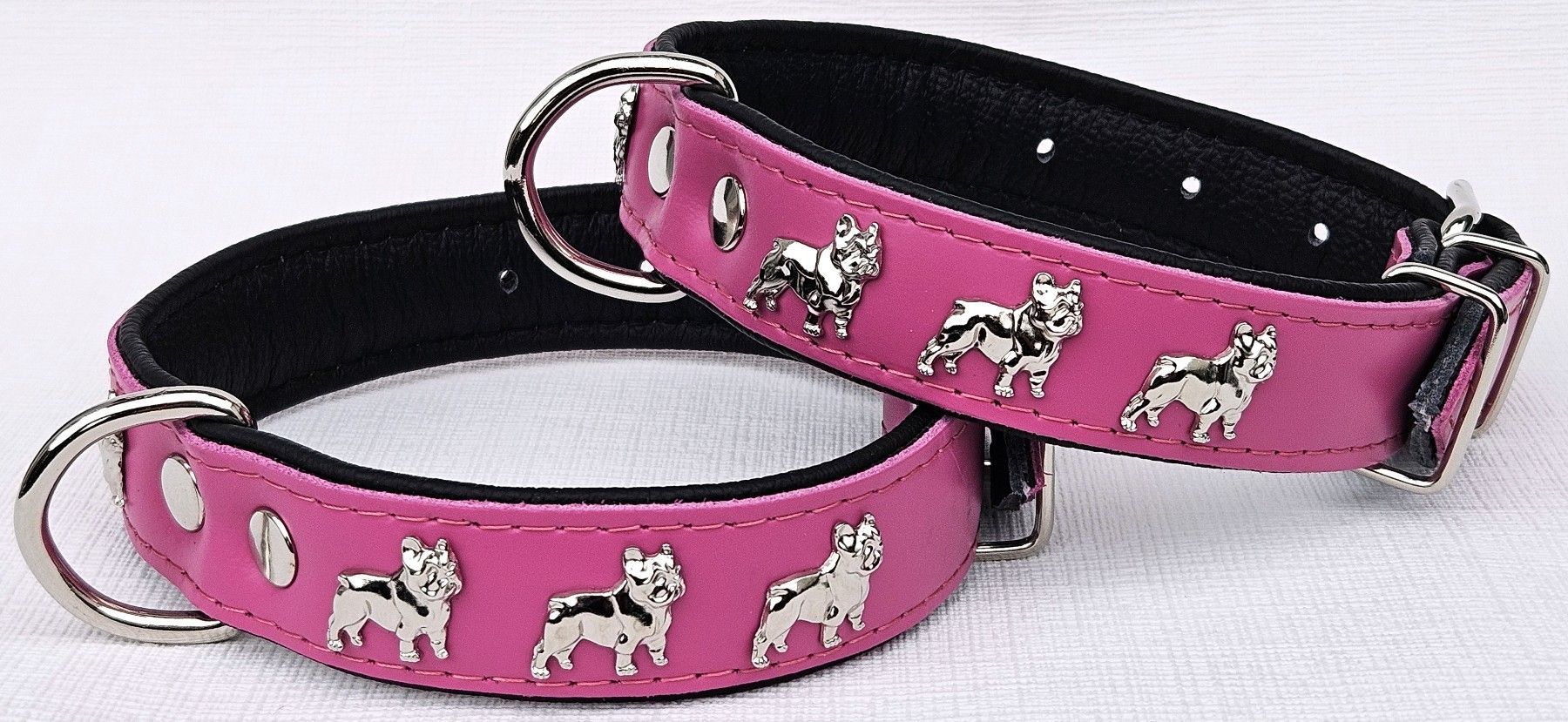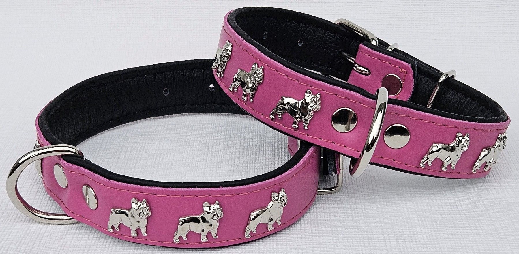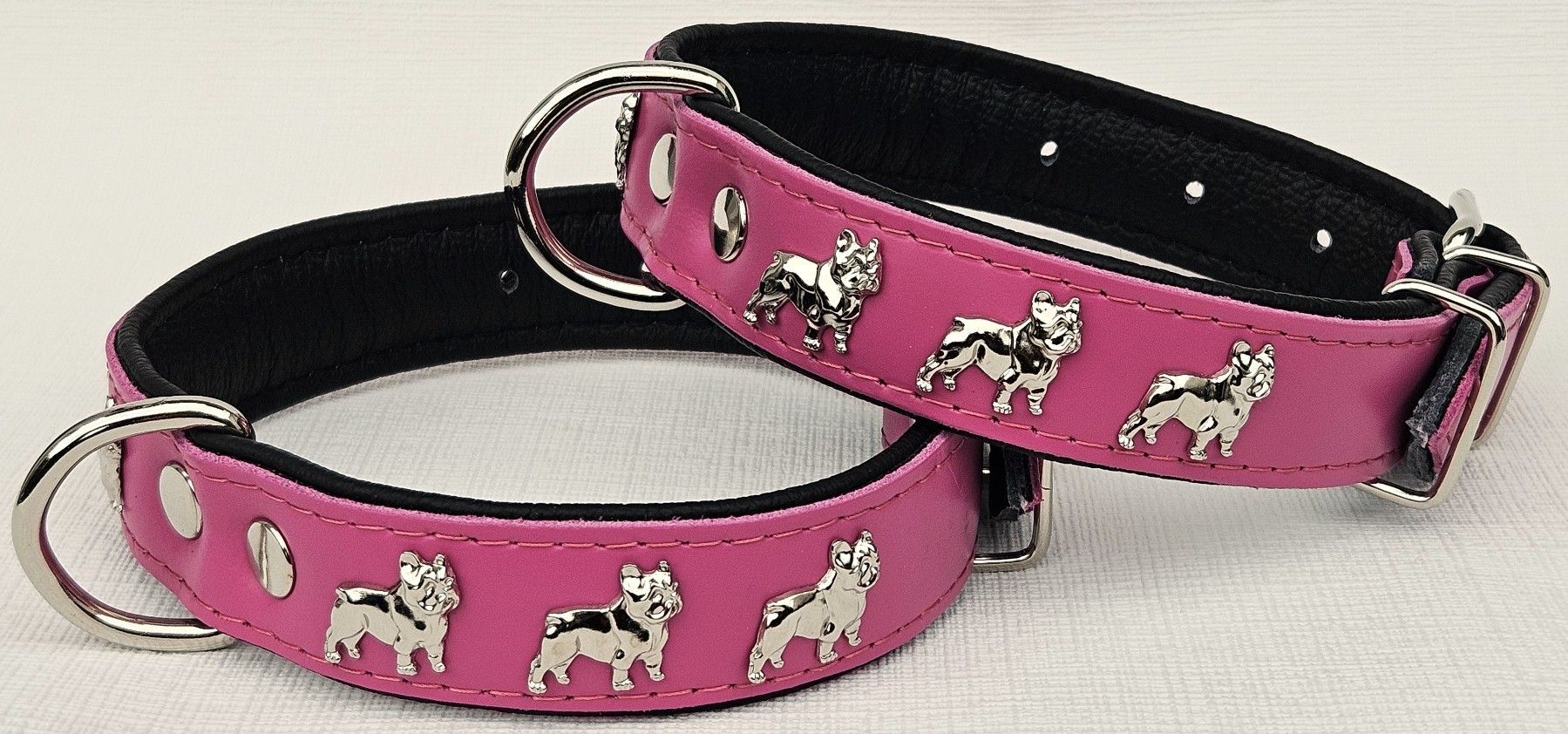 LEDERHALSBAND mit tollen Metallaplikationen * Bully - Französische Bulldogge Frenchie - French Bulldog * **** ROSA - Schwarz **** Maße: Gesamtlänge : 50 cm Halsumfang : 34 - 45cm (erste und letzte Loch) Breit : 30 mm Messen Sie hierzu bitte den Hals ihres Hundes . Material - 100% hochwertiges Leder,