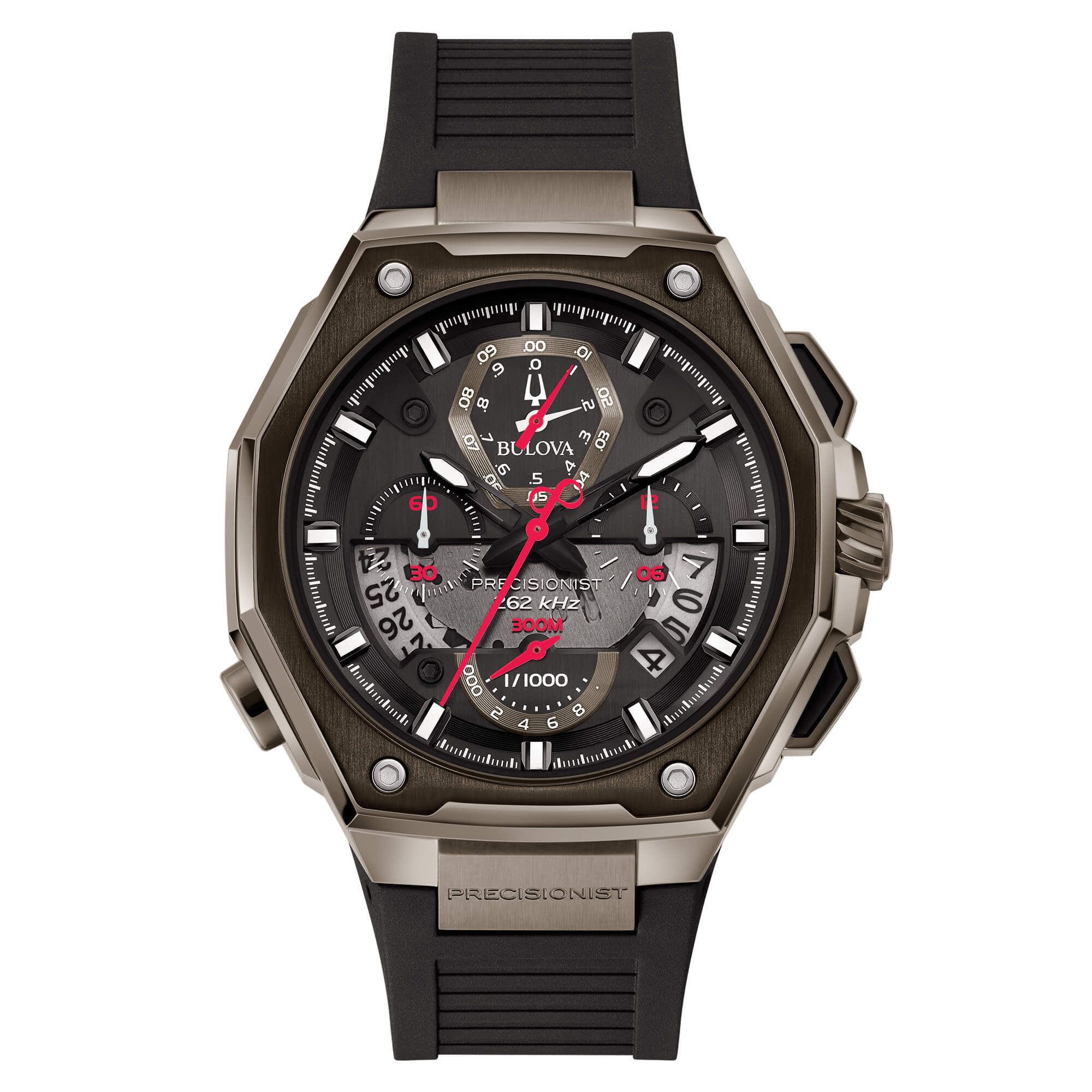 Marke: Bulova Referenz: 98B358 Geschlecht: Mann, Frau Ladezustand: Quarz Zifferblattfarbe: Schwarz Gehäusematerial: Stahl Armbandmaterial: Gummi Produktionsjahr: 2024 Bandfarbe: Schwarz Verschluss: Verschlussstift Verschlussmaterial: Stahl Gehäusedurchmesser: 45 mm Gehäusehöhe: 173 mm Wasserbeständi