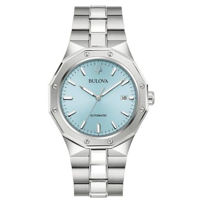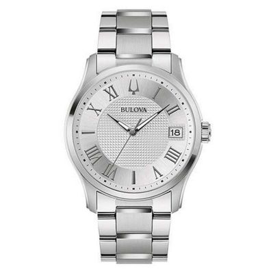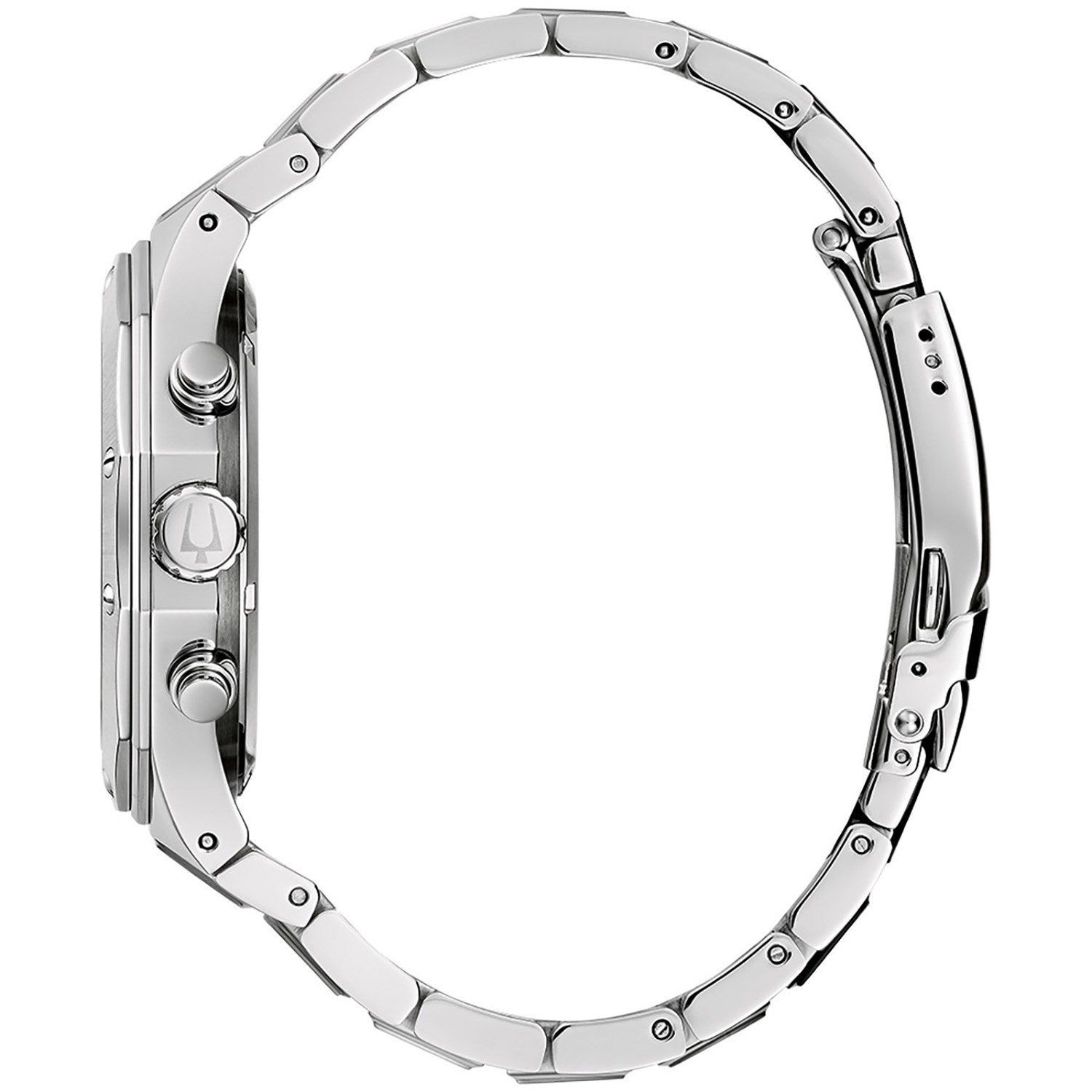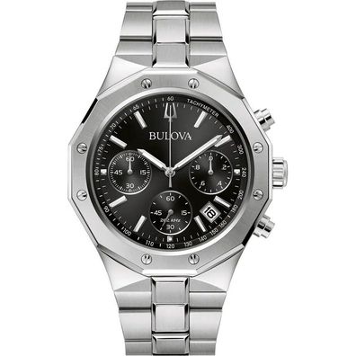 lässige Armbanduhr für Männer aus der Kollektion "Bulova Classic", präzises Quarzwerk mit einer Schwingungsfrequenz von 262 kHz, Datumsanzeige, Stoppfunktion bis 60 Minuten in 1/10 Sekundenschritten, Tachymeter-Skala, dunkelgrünes Sunray-Zifferblatt, lumineszierende Zeiger und Indizes, kleine Sekundenanzeige, poliertes Edelstahlgehäuse, mattierte Lünette mit Zierschrauben, verschraubter Gehäuseboden, geriffelte Krone mit Logo, kratzunempfindliches Mineralglas, Armband aus mattiertem Ed