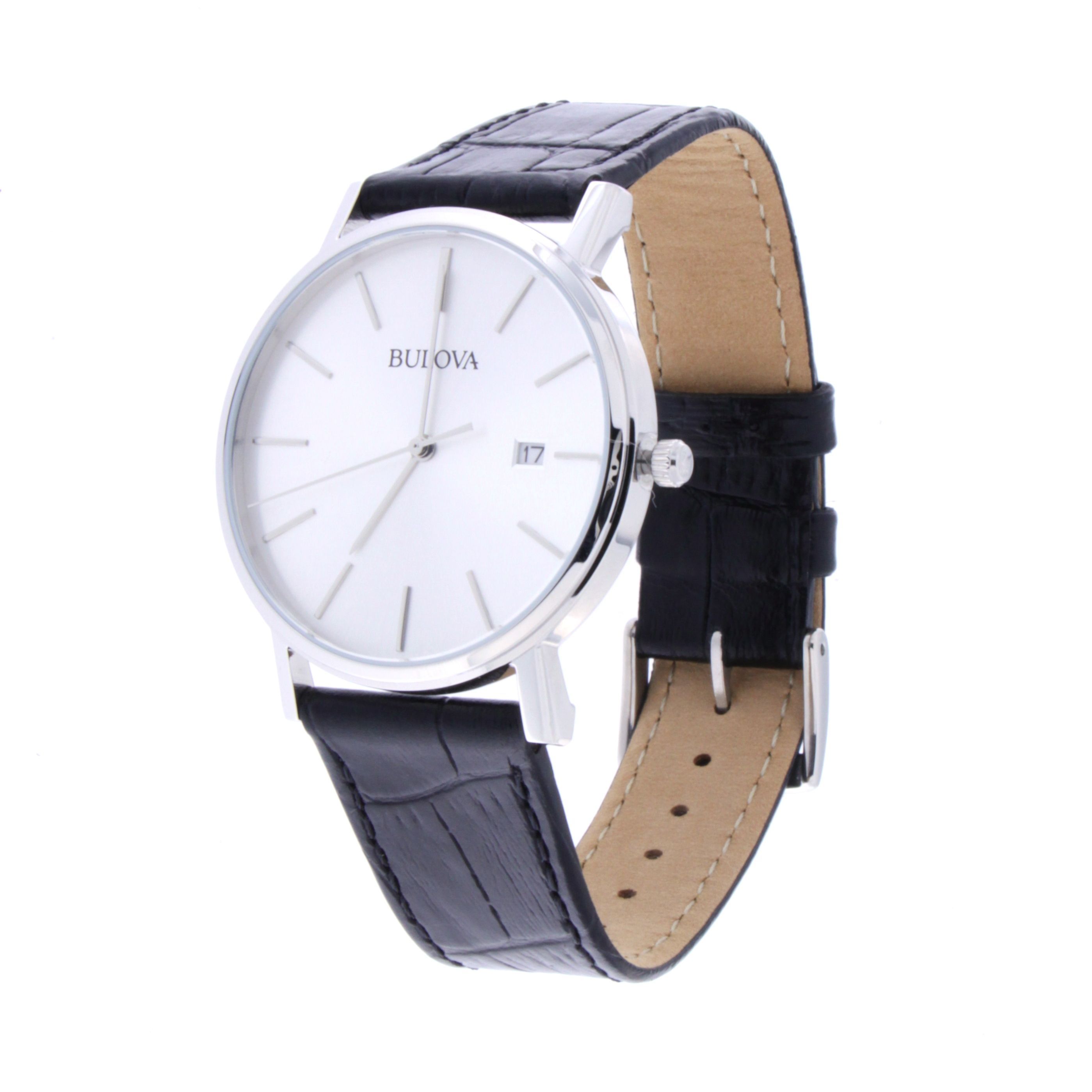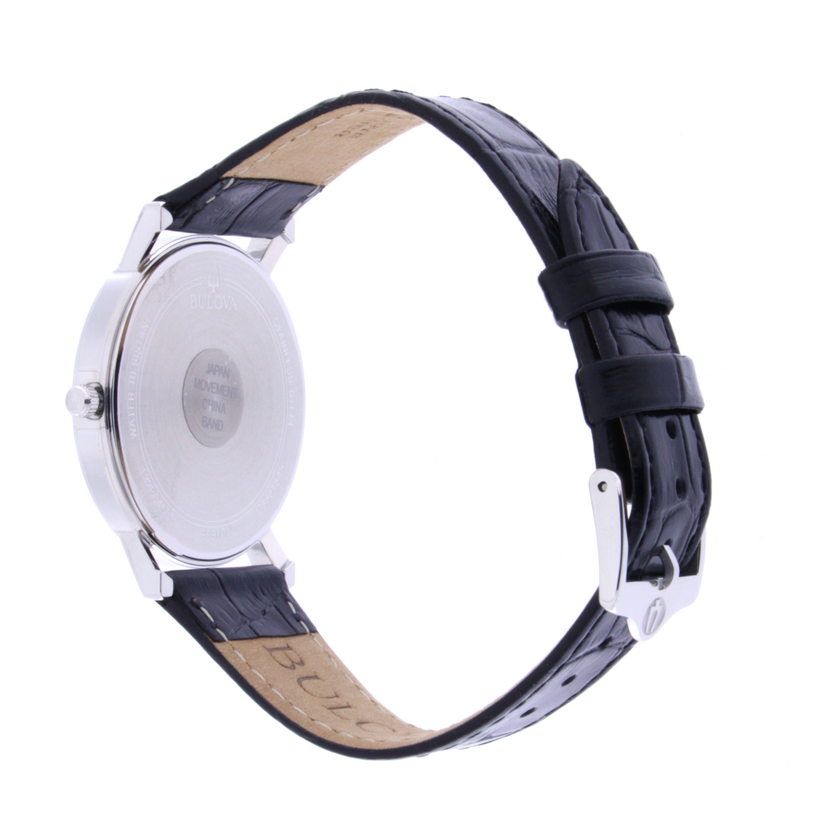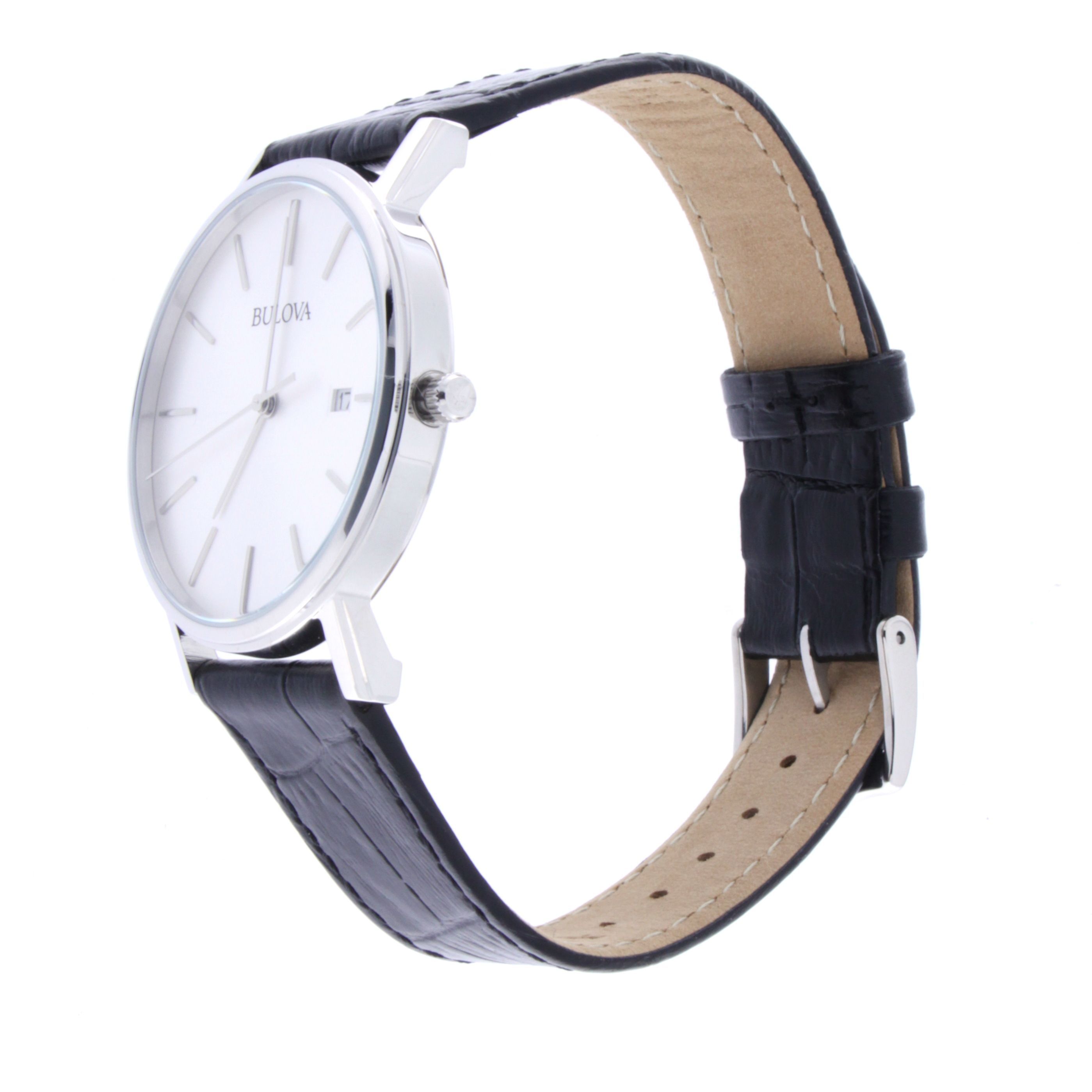 Marke: Bulova Referenz: 96B104 Geschlecht: Herren Ladezustand: Quarz Zifferblattfarbe: Weiß Gehäuse Material: Stahl Bandmaterial: Leder Produktionsjahr: 2024 Bandfarbe: Schwarz Verschluss: Klebeverschluss mit Widerhaken Verschlussmaterial: Stahl Gehäusedurchmesser: 37 mm Gehäusehöhe: 6 mm Wasserdich