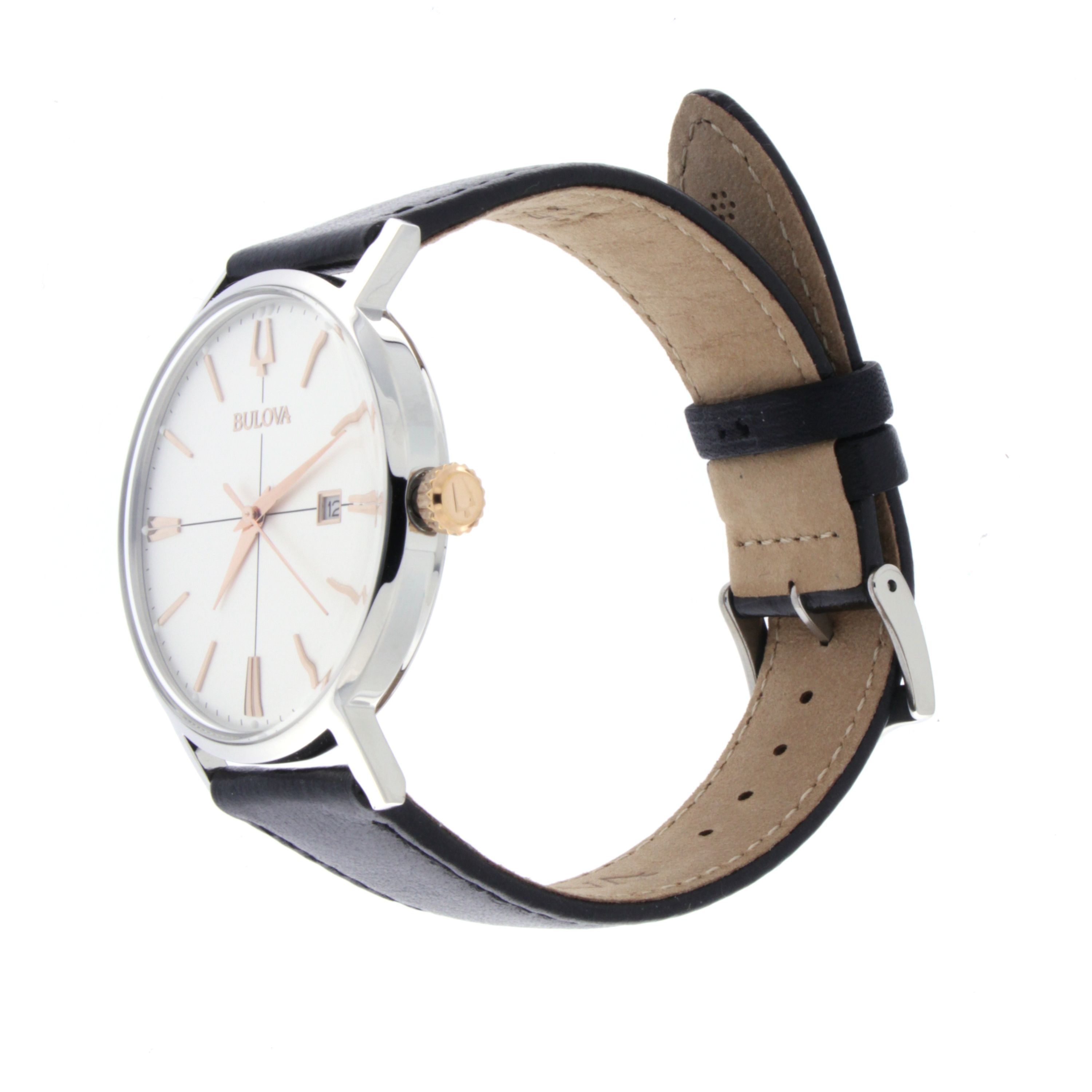 Marke: Bulova Referenz: 98B254 Geschlecht: Mann, Frau Ladezustand: Quarz Zifferblattfarbe: Weiß Gehäusematerial: Stahl Bandmaterial: Leder Produktionsjahr: 2024 Bandfarbe: Schwarz Verschluss: Widerhaken Verschlussmaterial: Stahl Gehäusedurchmesser: 39 mm Gehäusehöhe: 8 mm Wasserdichtigkeit: Wasserdi