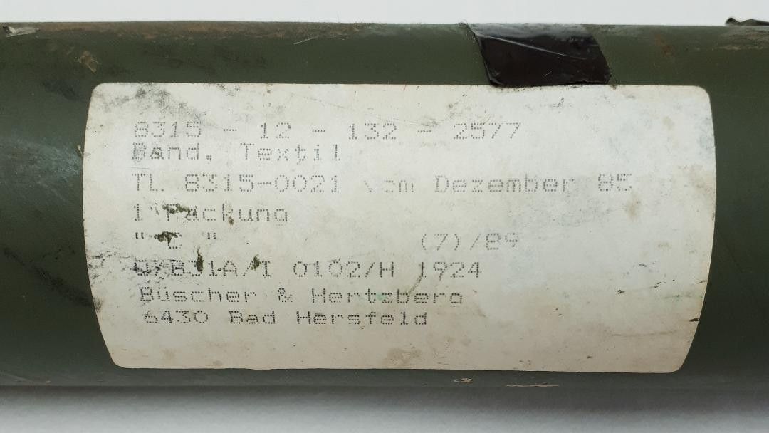 Bundeswehr ABC Textilband für ABC Einsatz K 38 * 13 Rollen Textilband (Bandbreite ca. 2 cm) in Papprolle * Gewicht: ca. 610 g Zustand: gut - gebraucht mit einigen Gebrauchsspuren HINWEIS: Aufgrund des gebrauchten Zustandes kann die tatsächliche Länge nicht korrekt angegeben werden!
