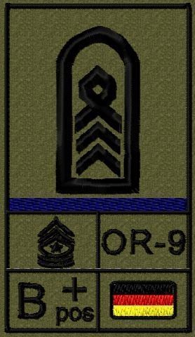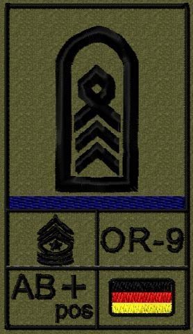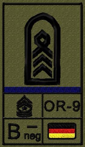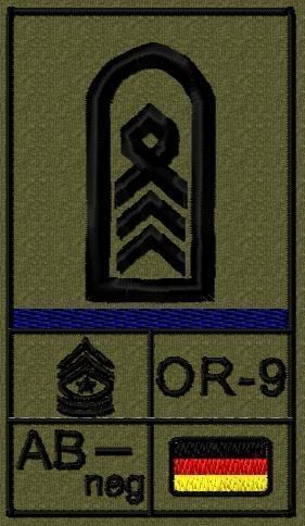 Dienstgradabzeichen auf Klett mit NATO-Rangcode, dem US Army-Dienstgrad, der Deutschlandflagge und der Blutgruppe mit Rhesusfaktor aufgestickt. Passt ideal auf das BW Unterhemd mit Klett auf der Brust oder auch auf dem Smock. Der Patch hat die Maße: B: 5,2cm x L: 9,3cm. Achtung: Bei der Auswahl der