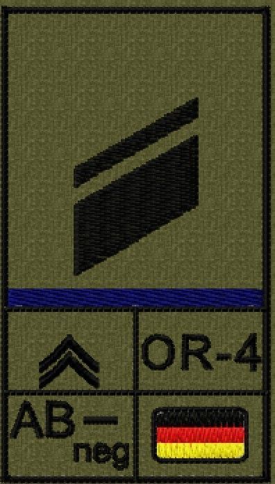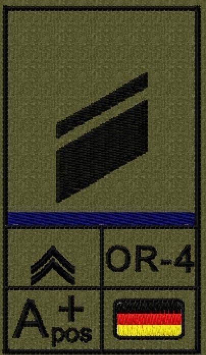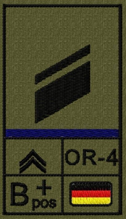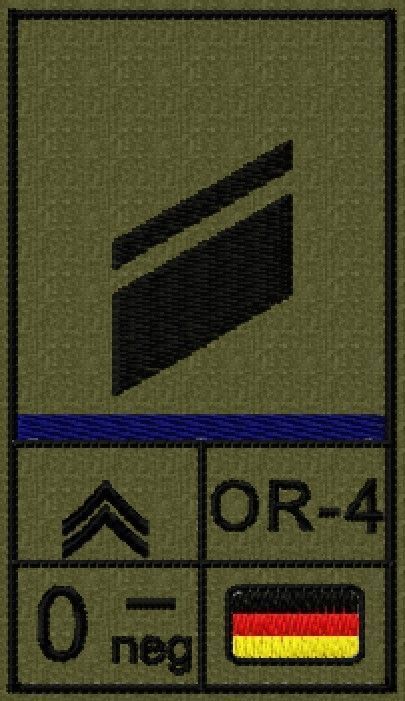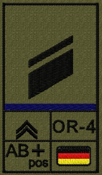 Dienstgradabzeichen auf Klett mit NATO-Rangcode, dem US Army-Dienstgrad, der Deutschlandflagge und der Blutgruppe mit Rhesusfaktor aufgestickt. Passt ideal auf das BW Unterhemd mit Klett auf der Brust oder auch auf dem Smock. Der Patch hat die Maße: B: 5,2cm x L: 9,3cm. Achtung: Bei der Auswahl der