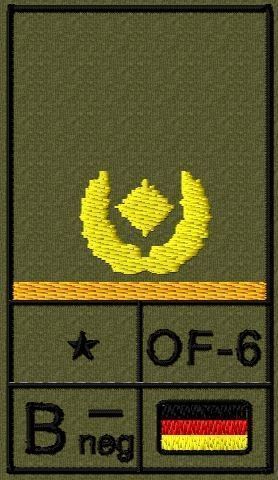 Dienstgradabzeichen auf Klett mit NATO-Rangcode, dem US Army-Dienstgrad, der Deutschlandflagge und der Blutgruppe mit Rhesusfaktor aufgestickt. Passt ideal auf das BW Unterhemd mit Klett auf der Brust oder auch auf dem Smock. Der Patch hat die Maße: B: 5,2cm x L: 9,3cm. Achtung: Bei der Auswahl der