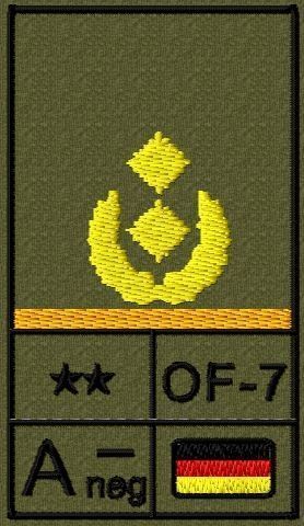 Dienstgradabzeichen auf Klett mit NATO-Rangcode, dem US Army-Dienstgrad, der Deutschlandflagge und der Blutgruppe mit Rhesusfaktor aufgestickt. Passt ideal auf das BW Unterhemd mit Klett auf der Brust oder auch auf dem Smock. Der Patch hat die Maße: B: 5,2cm x L: 9,3cm. Achtung: Bei der Auswahl der