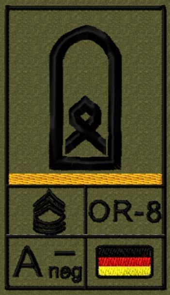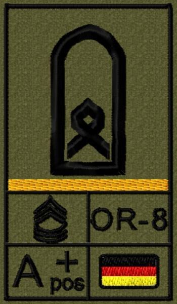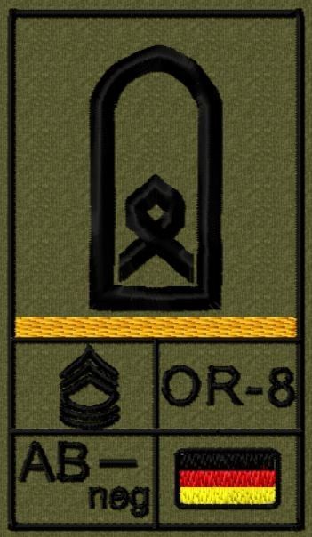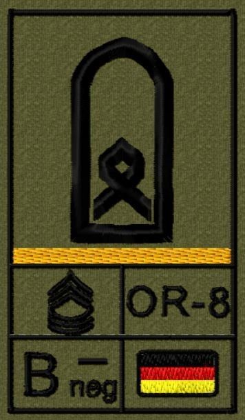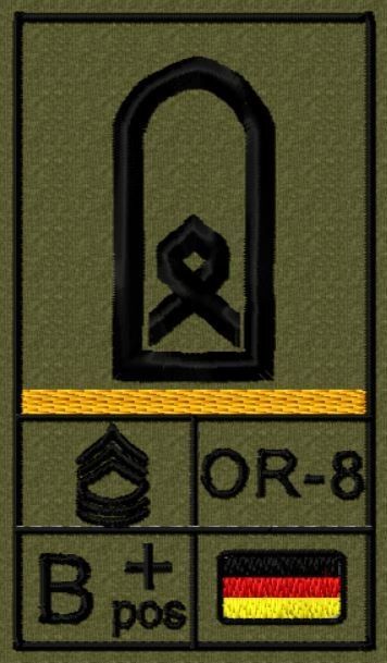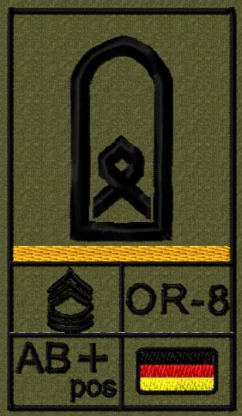 Dienstgradabzeichen auf Klett mit NATO-Rangcode, dem US Army-Dienstgrad, der Deutschlandflagge und der Blutgruppe mit Rhesusfaktor aufgestickt. Passt ideal auf das BW Unterhemd mit Klett auf der Brust oder auch auf dem Smock. Der Patch hat die Maße: B: 5,2cm x L: 9,3cm. Wir halten uns bei der Zuordn