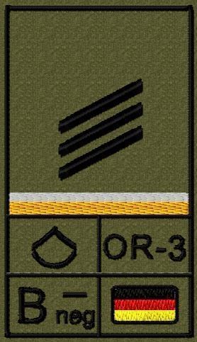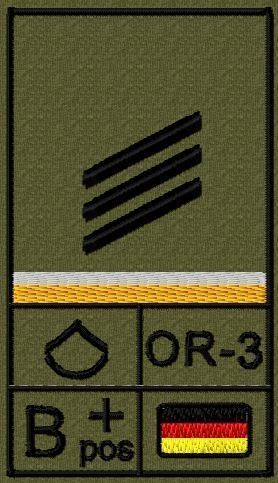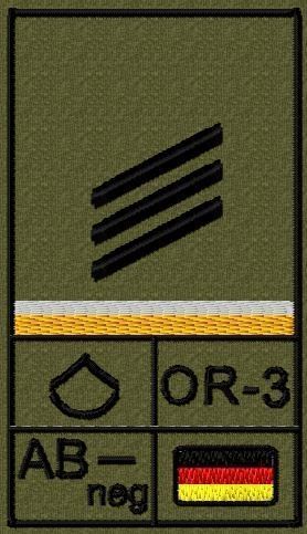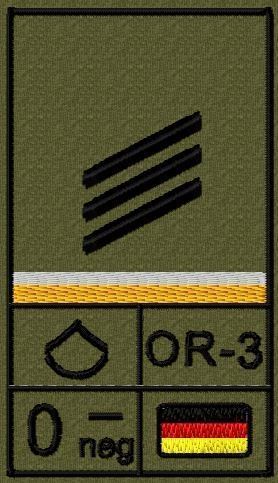Dienstgradabzeichen auf Klett mit NATO-Rangcode, dem US Army-Dienstgrad, der Deutschlandflagge und der Blutgruppe mit Rhesusfaktor aufgestickt. Passt ideal auf das BW Unterhemd mit Klett auf der Brust oder auch auf dem Smock. Der Patch hat die Maße: B: 5,2cm x L: 9,3cm. Achtung: Bei der Auswahl der