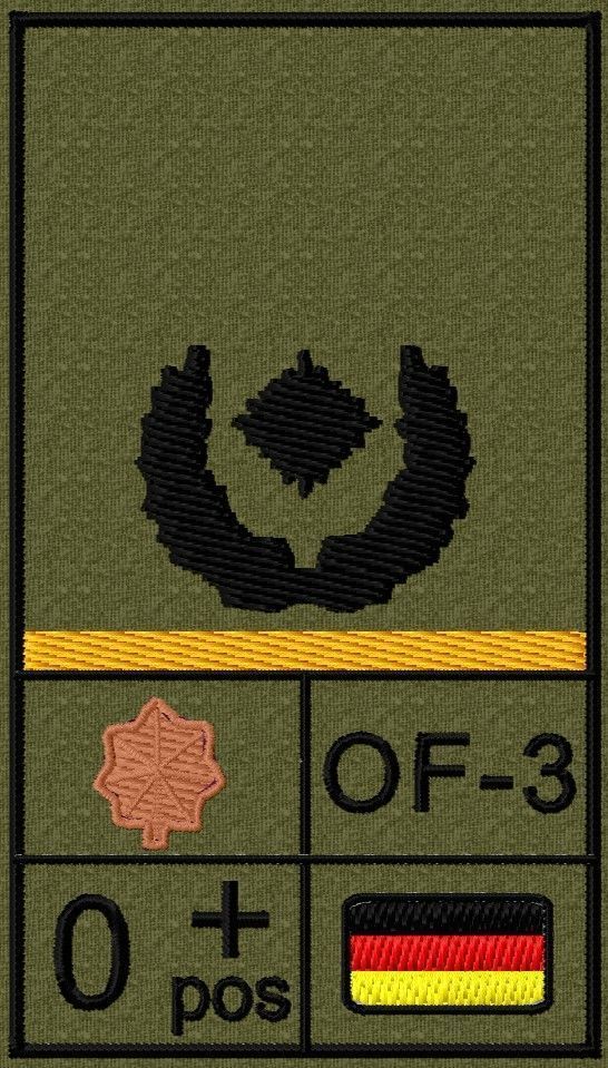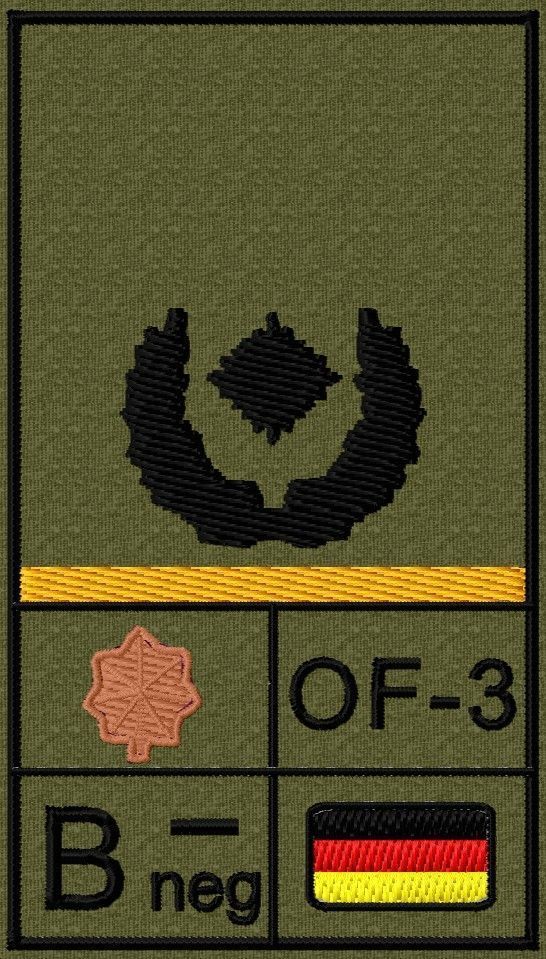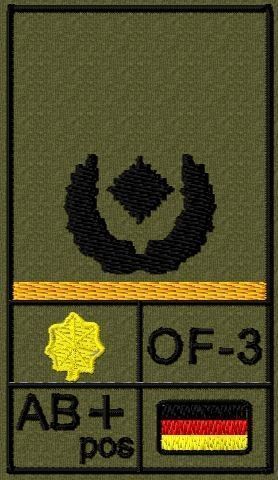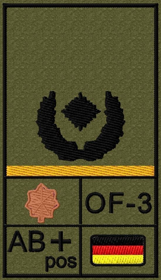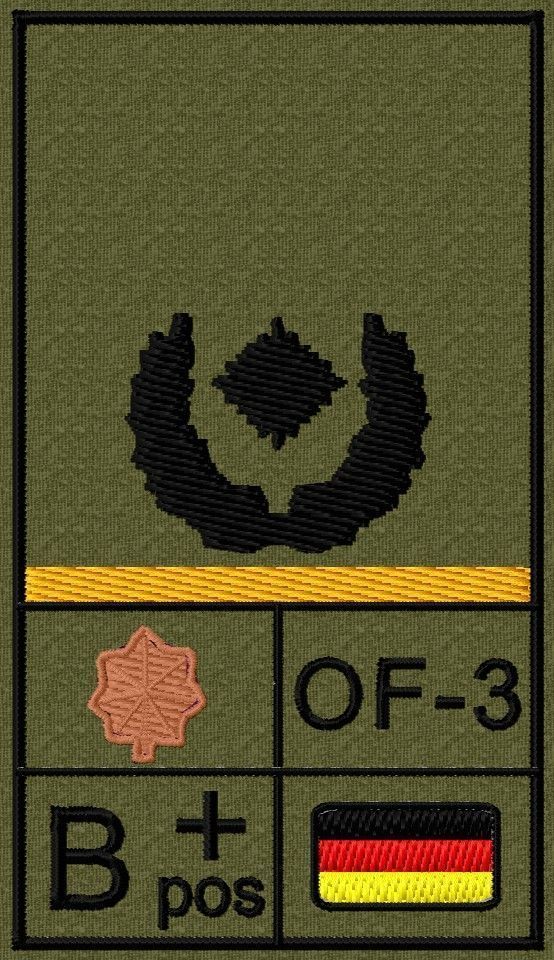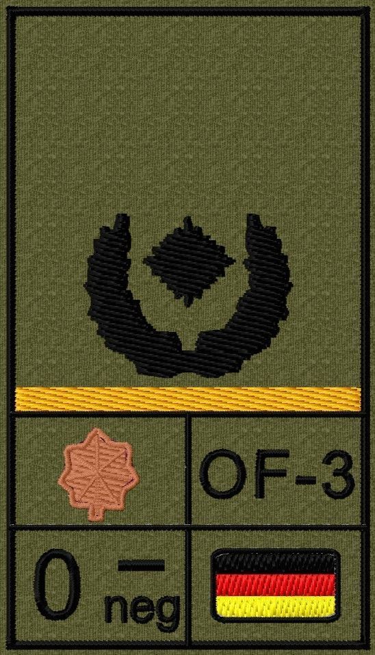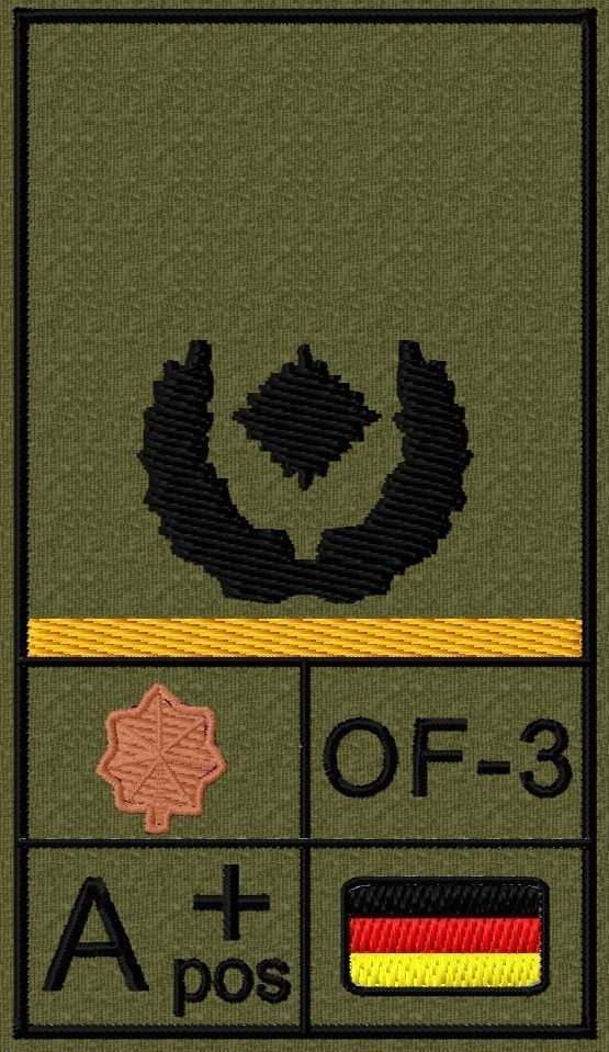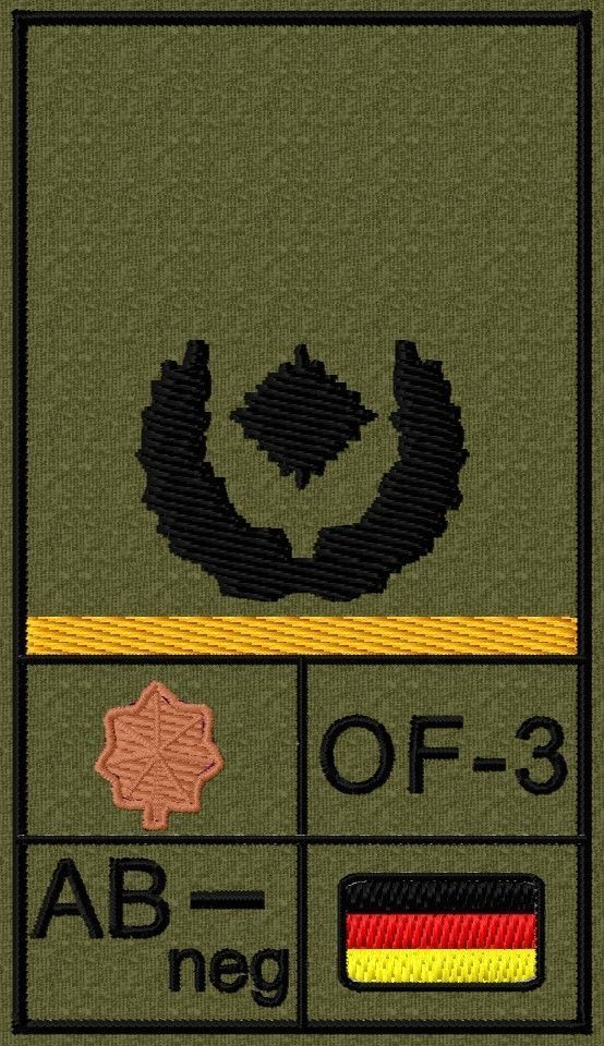 Dienstgradabzeichen auf Klett mit NATO-Rangcode, dem US Army-Dienstgrad, der Deutschlandflagge und der Blutgruppe mit Rhesusfaktor aufgestickt. Passt ideal auf das BW Unterhemd mit Klett auf der Brust oder auch auf dem Smock. Der Patch hat die Maße: B: 5,2cm x L: 9,3cm. Achtung: Bei der Auswahl der