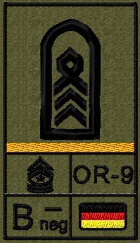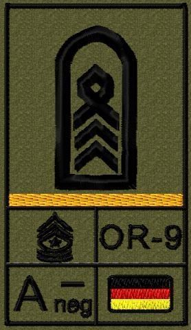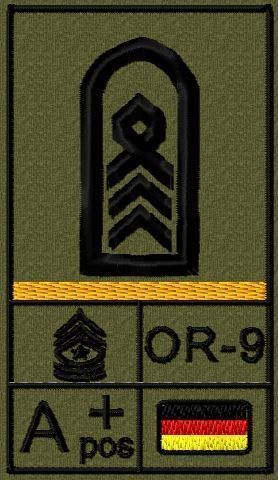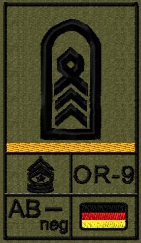Dienstgradabzeichen auf Klett mit NATO-Rangcode, dem US Army-Dienstgrad, der Deutschlandflagge und der Blutgruppe mit Rhesusfaktor aufgestickt. Passt ideal auf das BW Unterhemd mit Klett auf der Brust oder auch auf dem Smock. Der Patch hat die Maße: B: 5,2cm x L: 9,3cm. Achtung: Bei der Auswahl der
