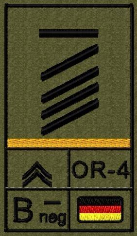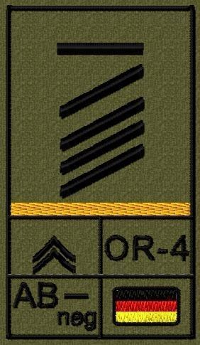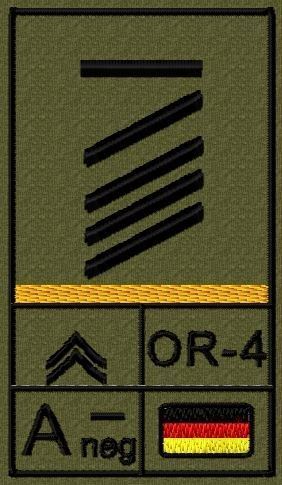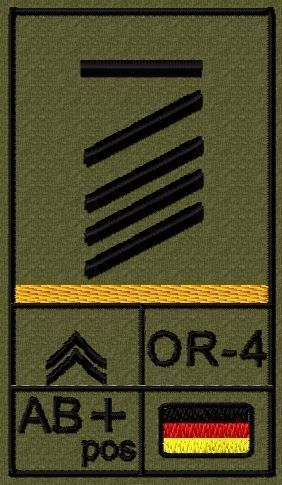 Dienstgradabzeichen auf Klett mit NATO-Rangcode, dem US Army-Dienstgrad, der Deutschlandflagge und der Blutgruppe mit Rhesusfaktor aufgestickt. Passt ideal auf das BW Unterhemd mit Klett auf der Brust oder auch auf dem Smock. Der Patch hat die Maße: B: 5,2cm x L: 9,3cm. Achtung: Bei der Auswahl der