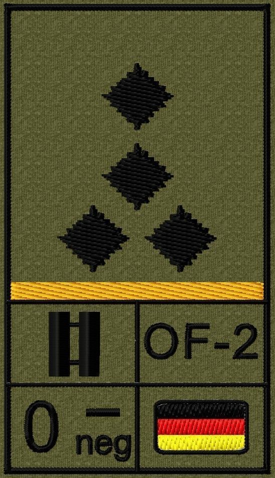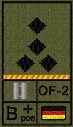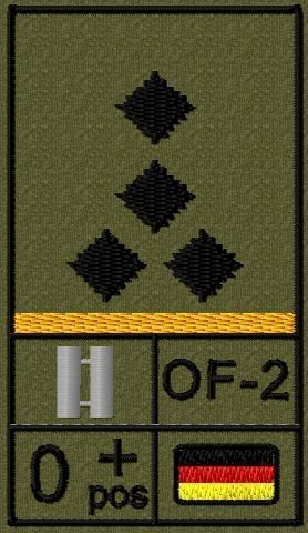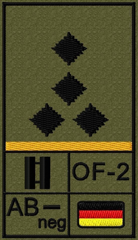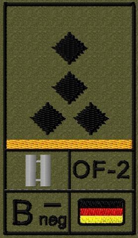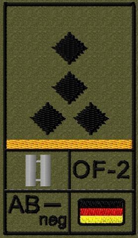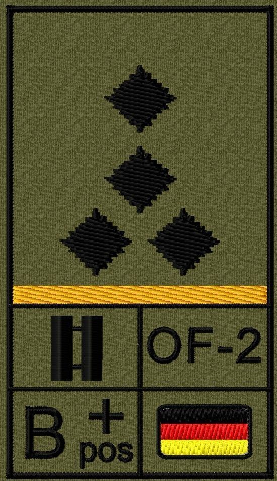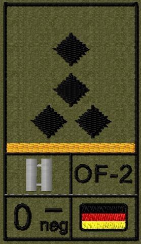 Dienstgradabzeichen auf Klett mit NATO-Rangcode, dem US Army-Dienstgrad, der Deutschlandflagge und der Blutgruppe mit Rhesusfaktor aufgestickt. Passt ideal auf das BW Unterhemd mit Klett auf der Brust oder auch auf dem Smock. Der Patch hat die Maße: B: 5,2cm x L: 9,3cm. Achtung: Bei der Auswahl der