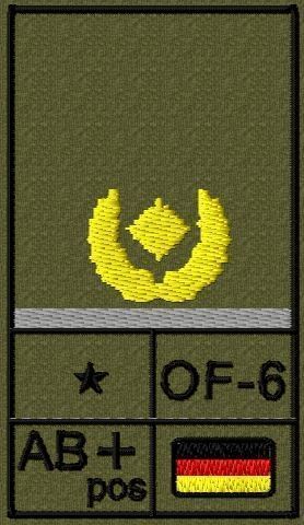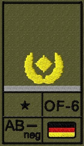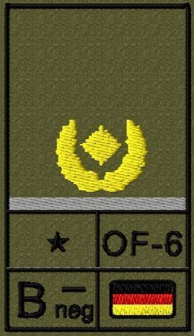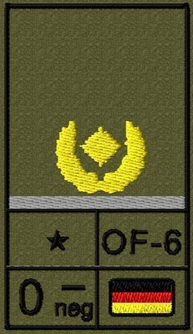 Dienstgradabzeichen auf Klett mit NATO-Rangcode, dem US Army-Dienstgrad, der Deutschlandflagge und der Blutgruppe mit Rhesusfaktor aufgestickt. Passt ideal auf das BW Unterhemd mit Klett auf der Brust oder auch auf dem Smock. Der Patch hat die Maße: B: 5,2cm x L: 9,3cm. Achtung: Bei der Auswahl der