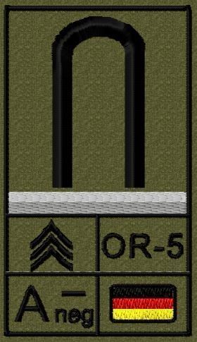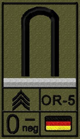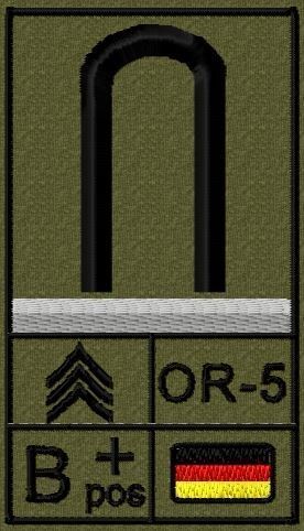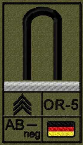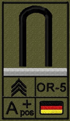 Dienstgradabzeichen auf Klett mit NATO-Rangcode, dem US Army-Dienstgrad, der Deutschlandflagge und der Blutgruppe mit Rhesusfaktor aufgestickt. Passt ideal auf das BW Unterhemd mit Klett auf der Brust oder auch auf dem Smock. Der Patch hat die Maße: B: 5,2cm x L: 9,3cm. Achtung: Bei der Auswahl der