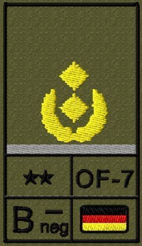 Dienstgradabzeichen auf Klett mit NATO-Rangcode, dem US Army-Dienstgrad, der Deutschlandflagge und der Blutgruppe mit Rhesusfaktor aufgestickt. Passt ideal auf das BW Unterhemd mit Klett auf der Brust oder auch auf dem Smock. Der Patch hat die Maße: B: 5,2cm x L: 9,3cm. Achtung: Bei der Auswahl der