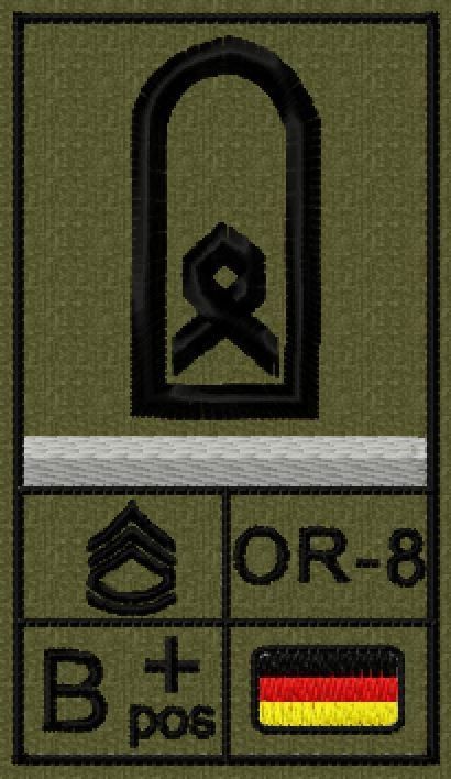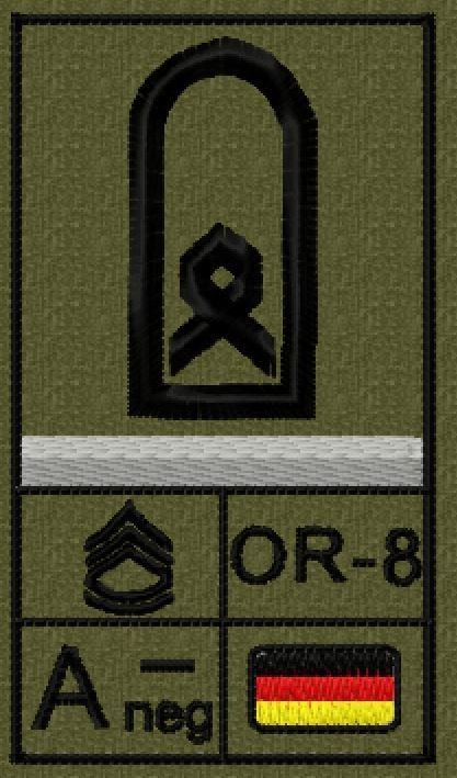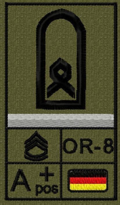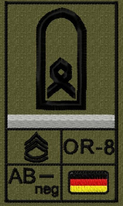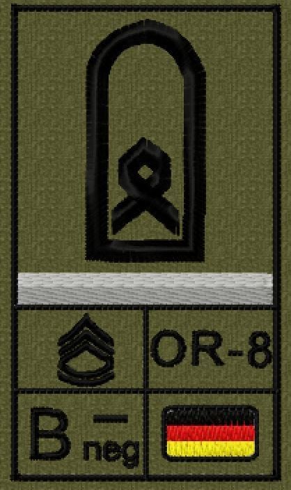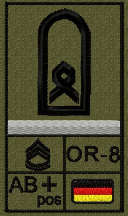 Dienstgradabzeichen auf Klett mit NATO-Rangcode, dem US Army-Dienstgrad, der Deutschlandflagge und der Blutgruppe mit Rhesusfaktor aufgestickt. Passt ideal auf das BW Unterhemd mit Klett auf der Brust oder auch auf dem Smock. Der Patch hat die Maße: B: 5,2cm x L: 9,3cm. Achtung: Bei der Auswahl der