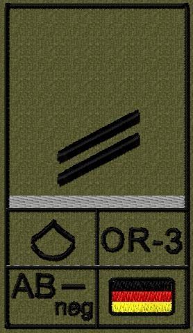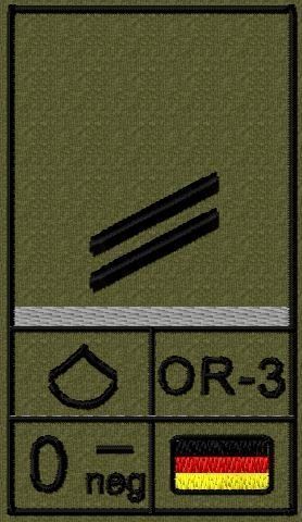 Dienstgradabzeichen auf Klett mit NATO-Rangcode, dem US Army-Dienstgrad, der Deutschlandflagge und der Blutgruppe mit Rhesusfaktor aufgestickt. Passt ideal auf das BW Unterhemd mit Klett auf der Brust oder auch auf dem Smock. Der Patch hat die Maße: B: 5,2cm x L: 9,3cm. Achtung: Bei der Auswahl der